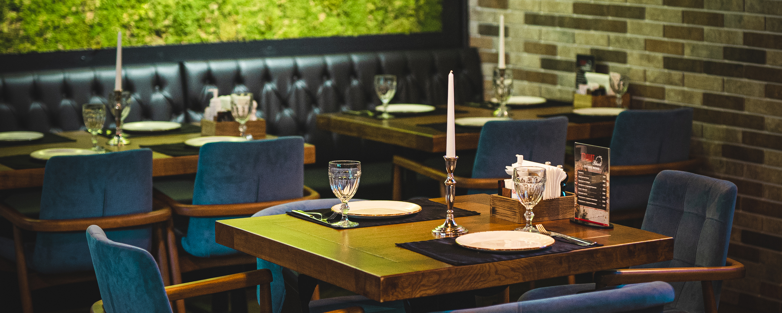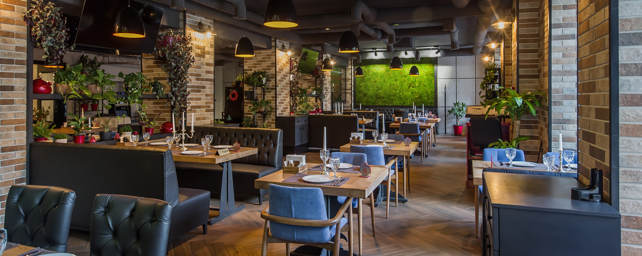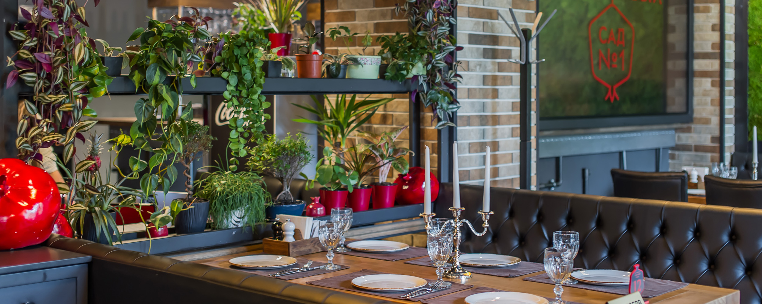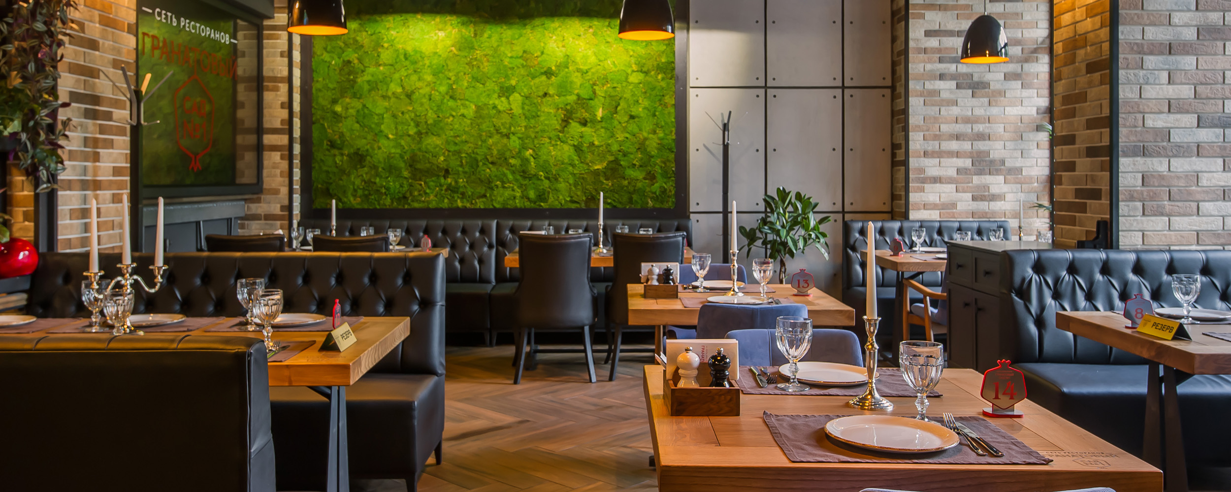Пространство «Гранат Black» получилось умиротворяющим, с намеком на аристократичность. Основной зал встречает гостей панорамными окнами с декоративной раскладкой и живописным видом на парк, стены выполнены из кирпича как отсылка к богатому восточному дому, а по всему периметру заведения расставлены зеленые растения: пальмы, рододендроны и другая растительность как всесезонное напоминание о лете.