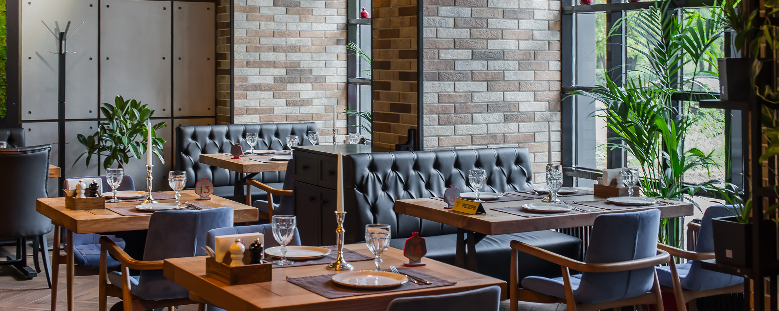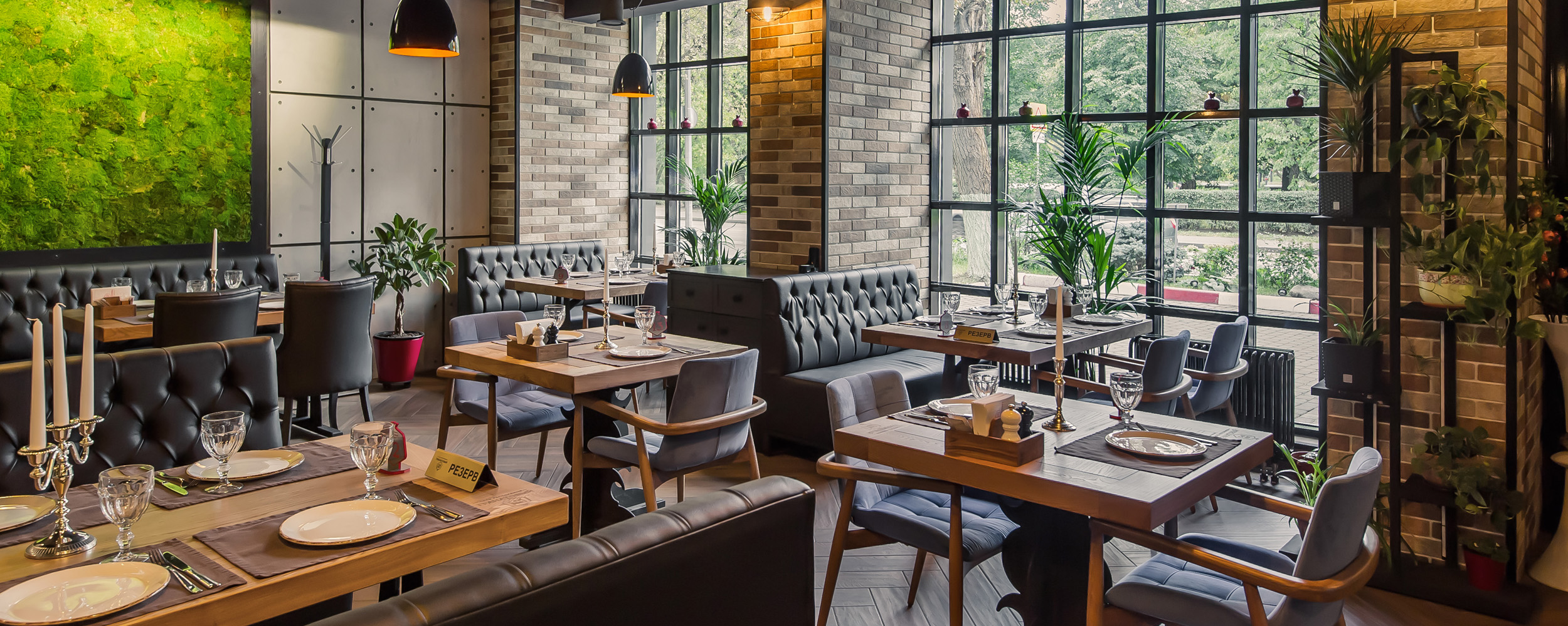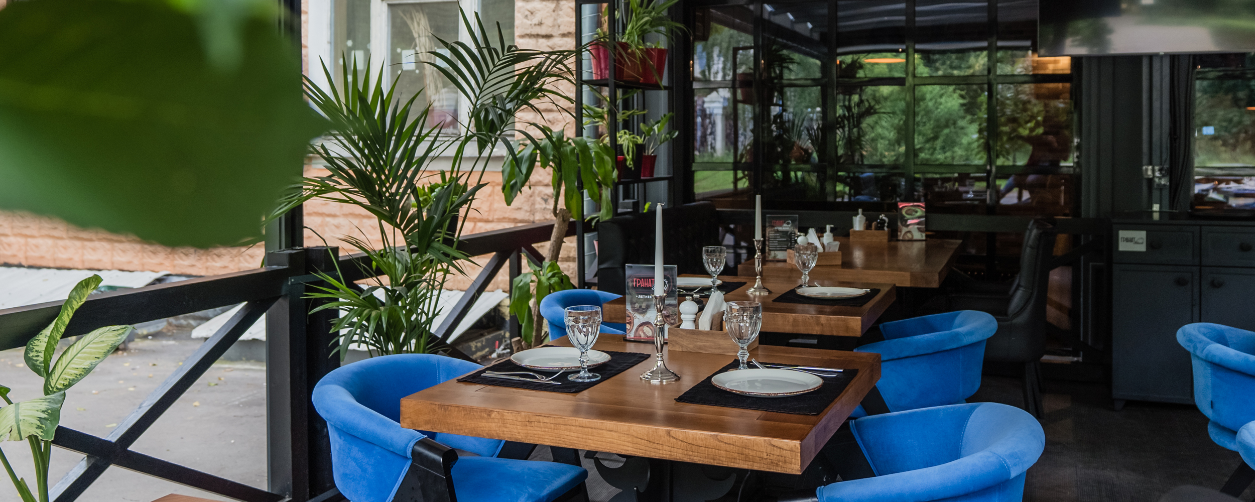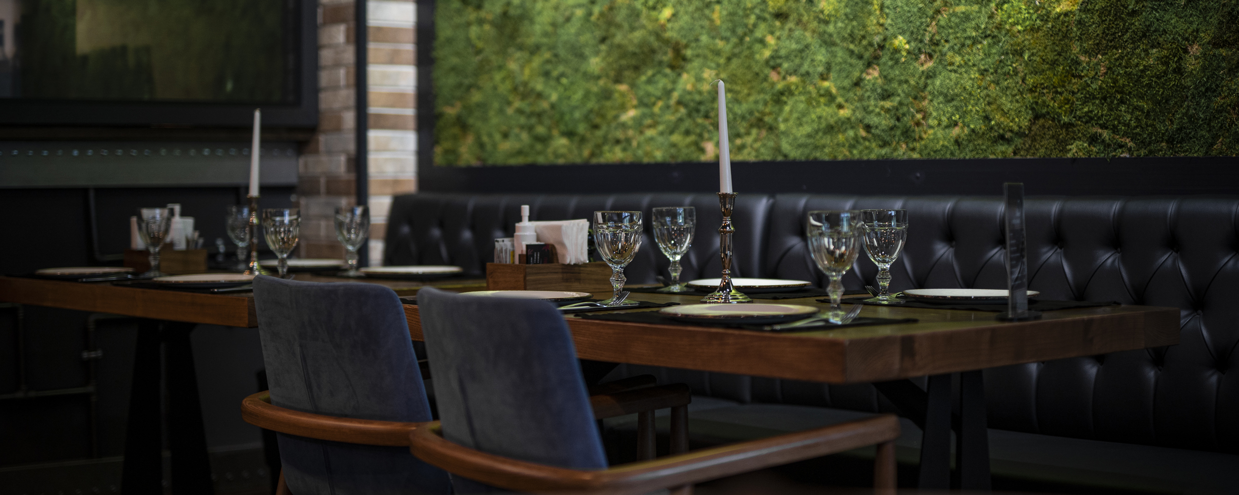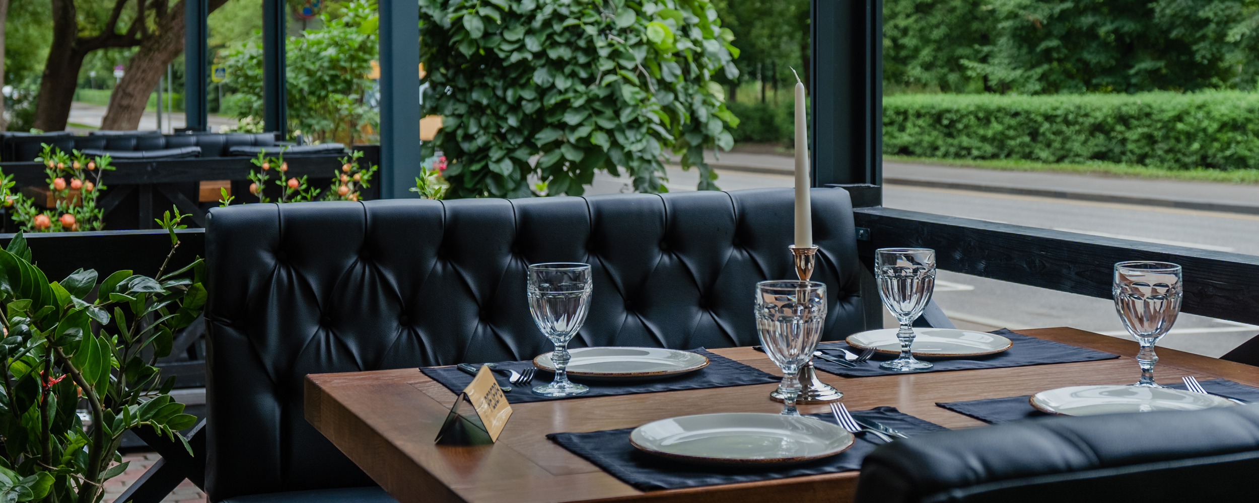 Пространство «Гранат Black» получилось умиротворяющим, с намеком на аристократичность. Основной зал встречает гостей панорамными окнами с декоративной раскладкой и живописным видом на парк, стены выполнены из кирпича как отсылка к богатому восточному дому, а по всему периметру заведения расставлены зеленые растения: пальмы, рододендроны и другая растительность как всесезонное напоминание о лете.