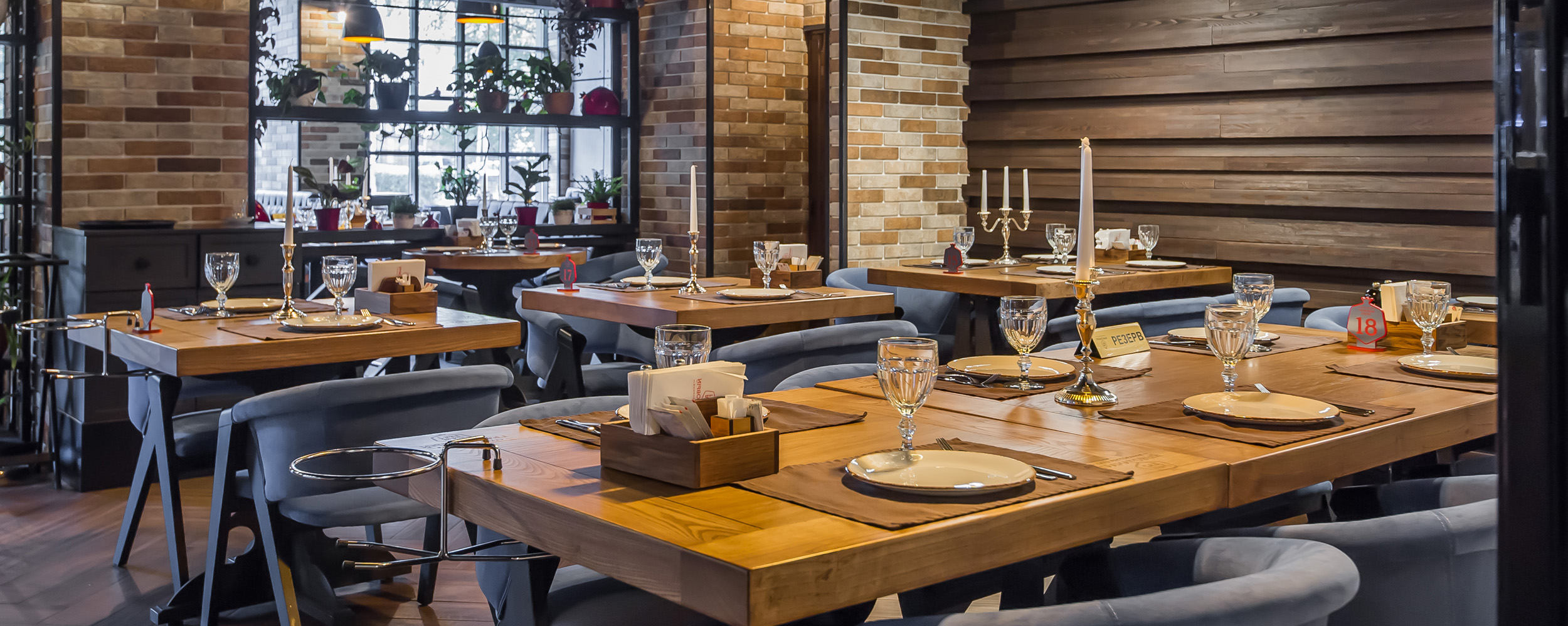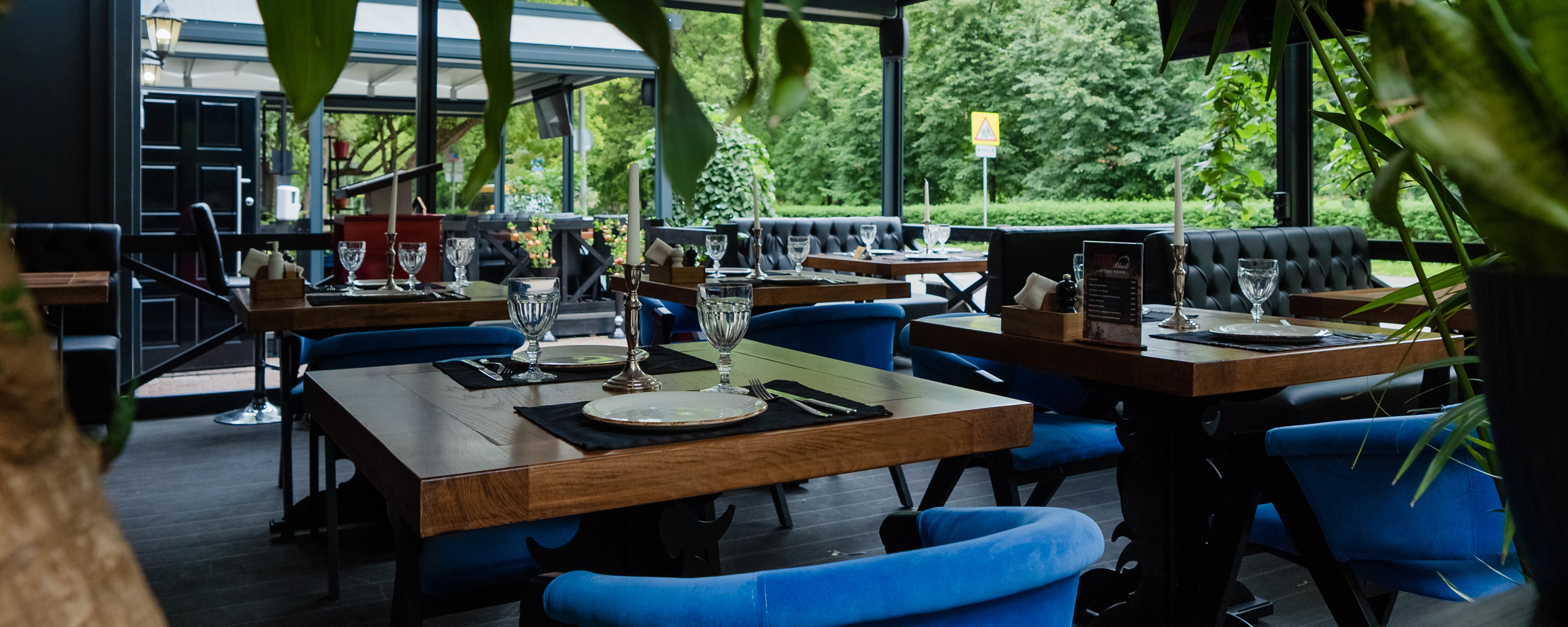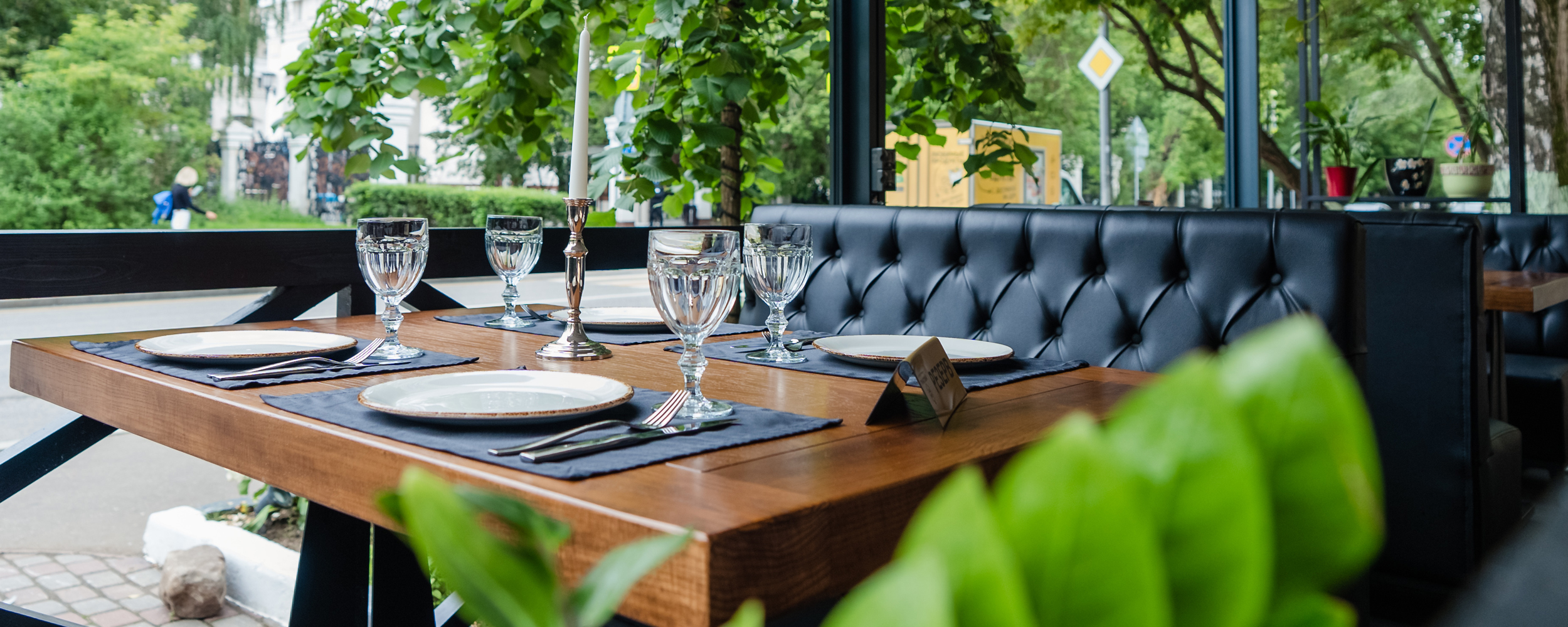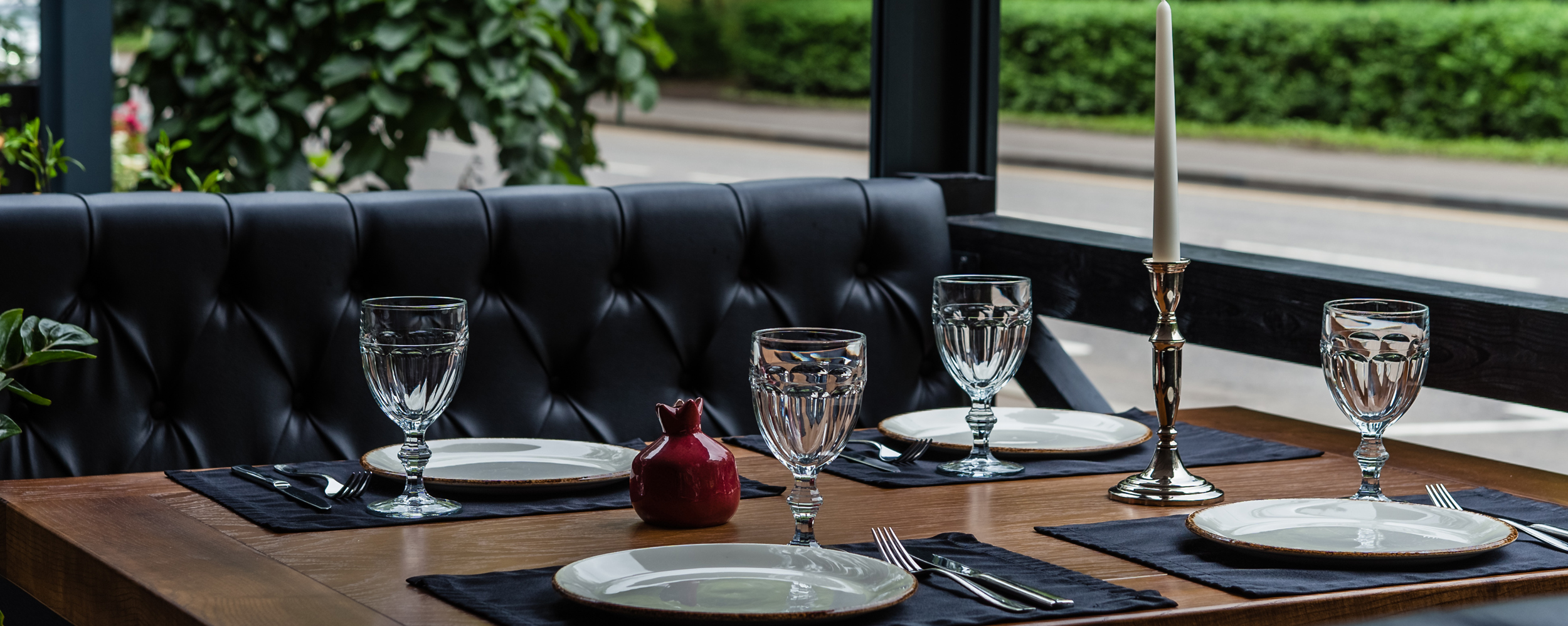 Пространство «Гранат Black» получилось умиротворяющим, с намеком на аристократичность. Основной зал встречает гостей панорамными окнами с декоративной раскладкой и живописным видом на парк, стены выполнены из кирпича как отсылка к богатому восточному дому, а по всему периметру заведения расставлены зеленые растения: пальмы, рододендроны и другая растительность как всесезонное напоминание о лете.