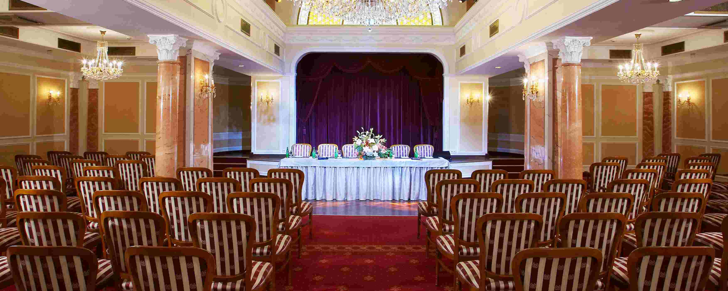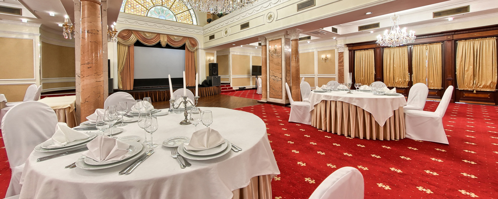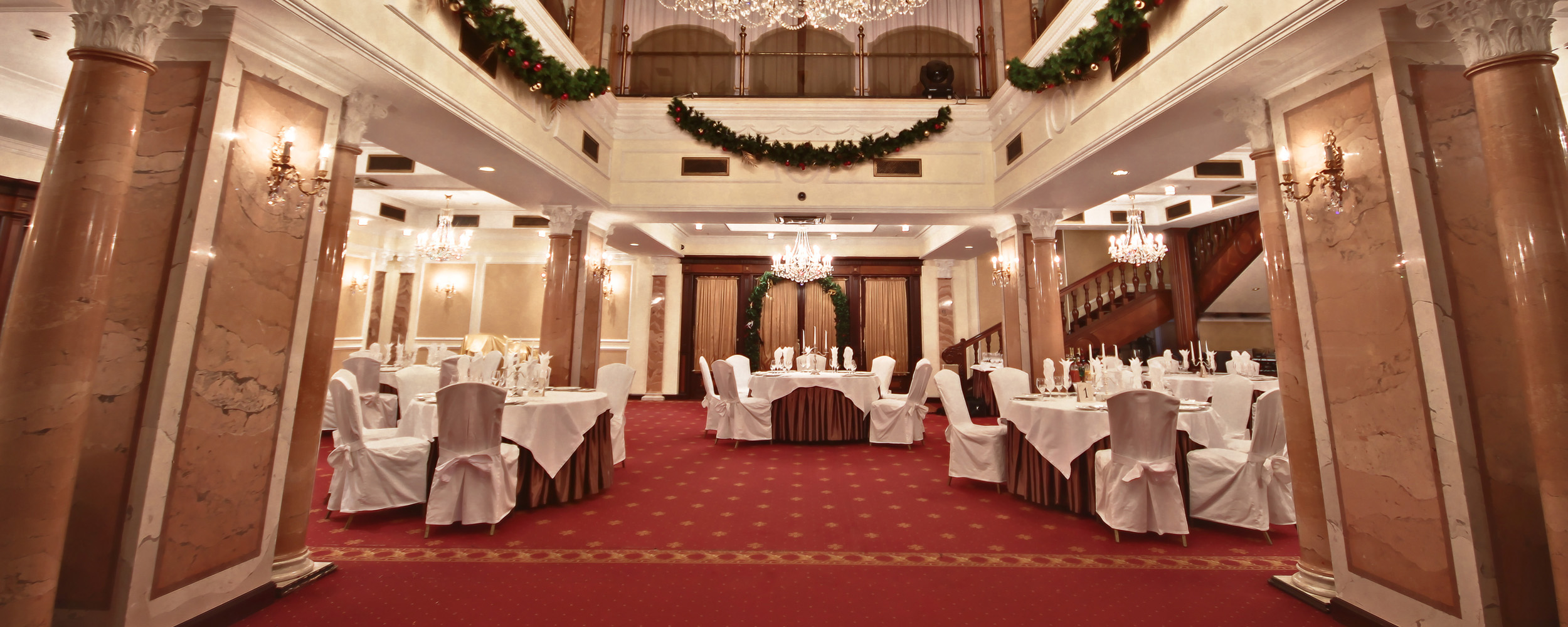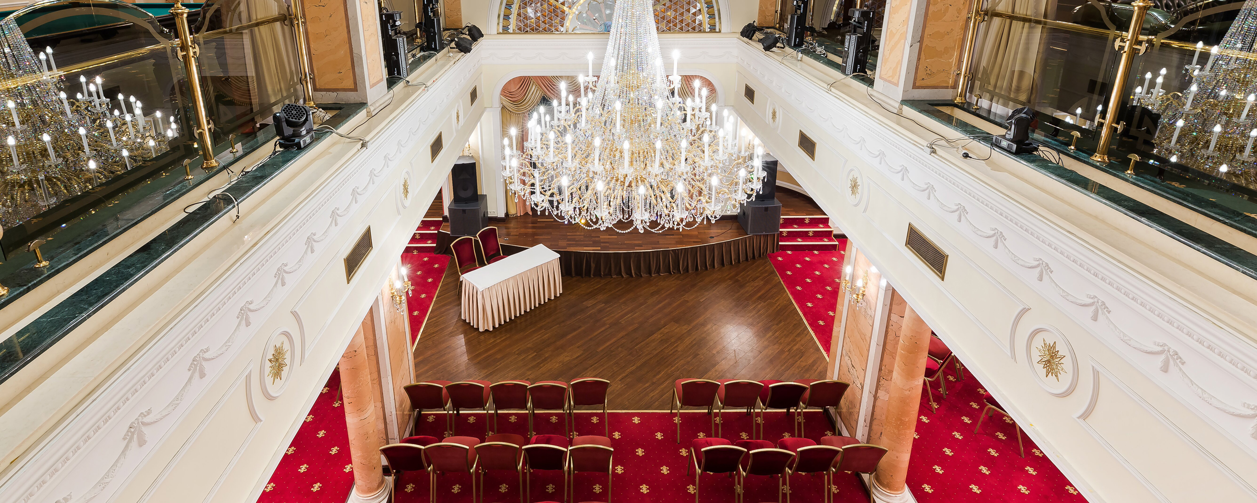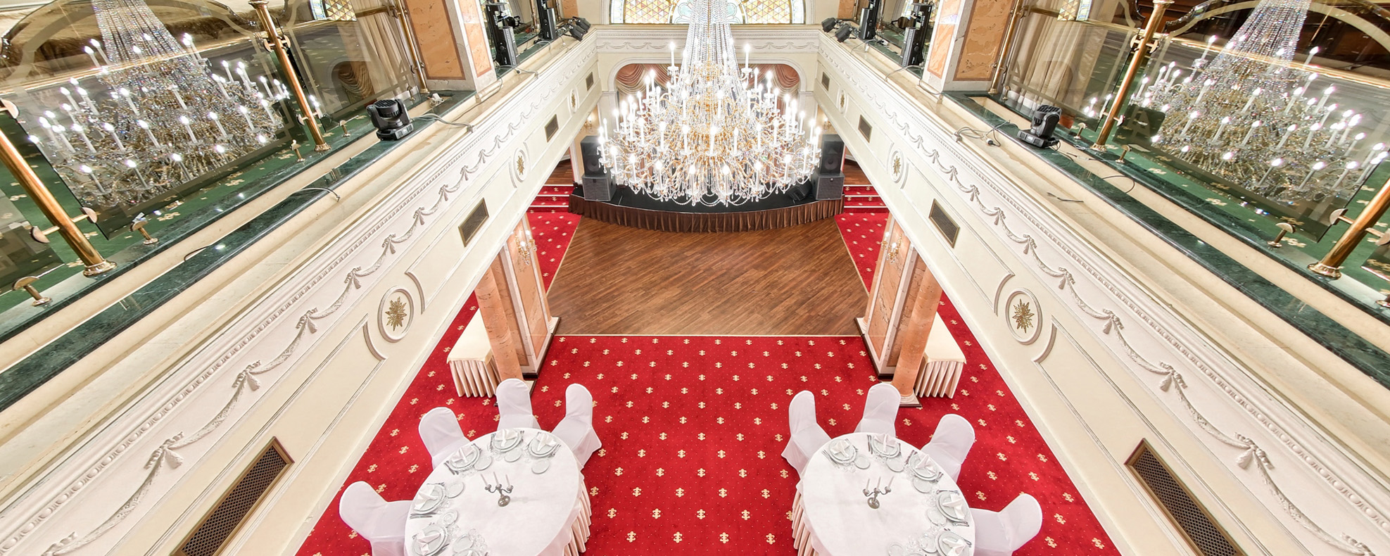 Этот просторный зал идеально подойдет для пышных свадеб с большим количеством участников. Инфраструктура зала включает в себя профессиональную сцену, гримерную комнату, световое и звуковое оборудование. Мрамор и хрусталь – сочетание, которое не оставит равнодушным людей, ценящих королевскую роскошь и выдержанный стиль.