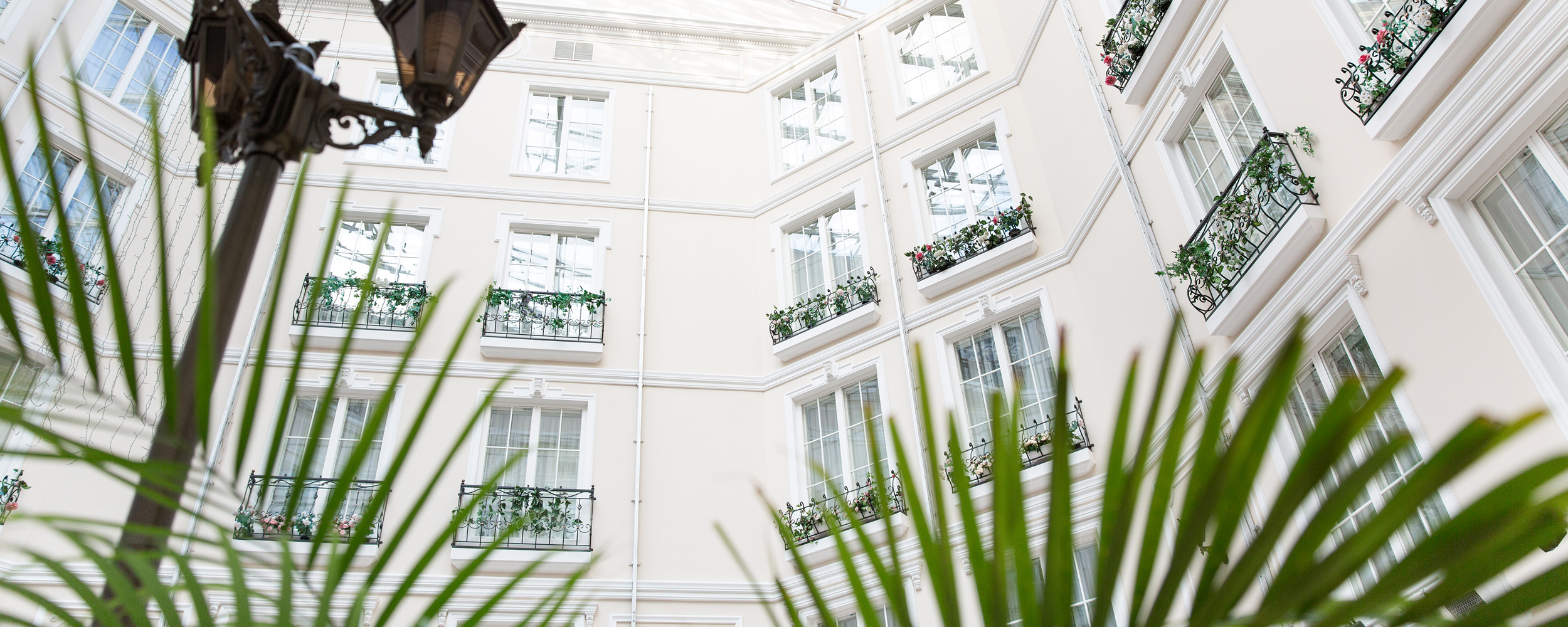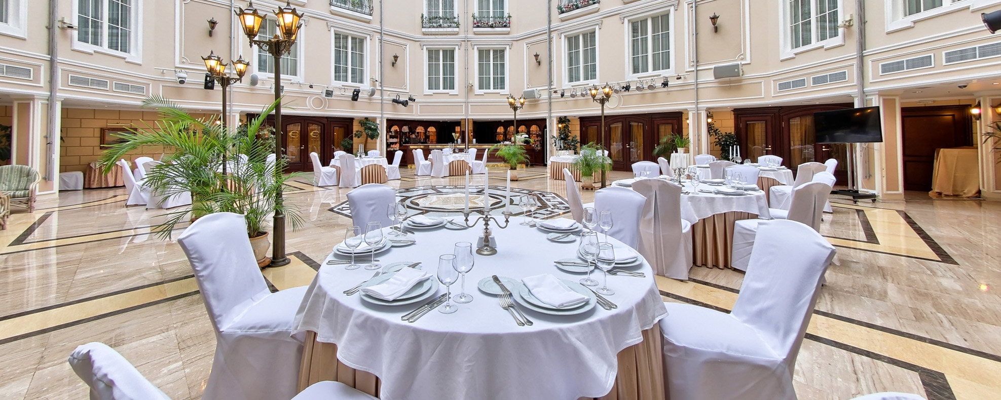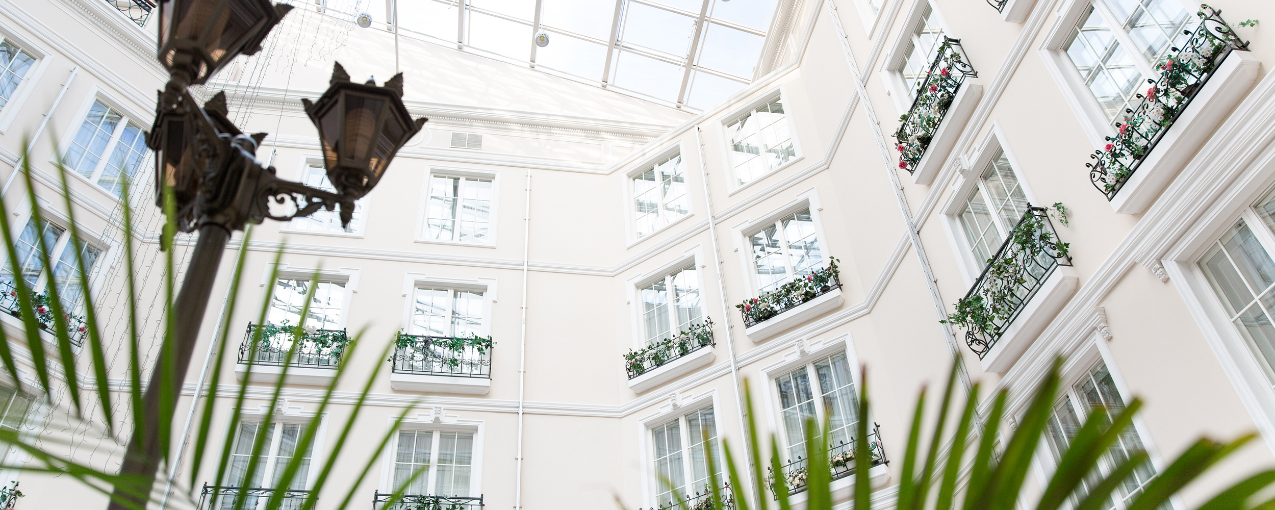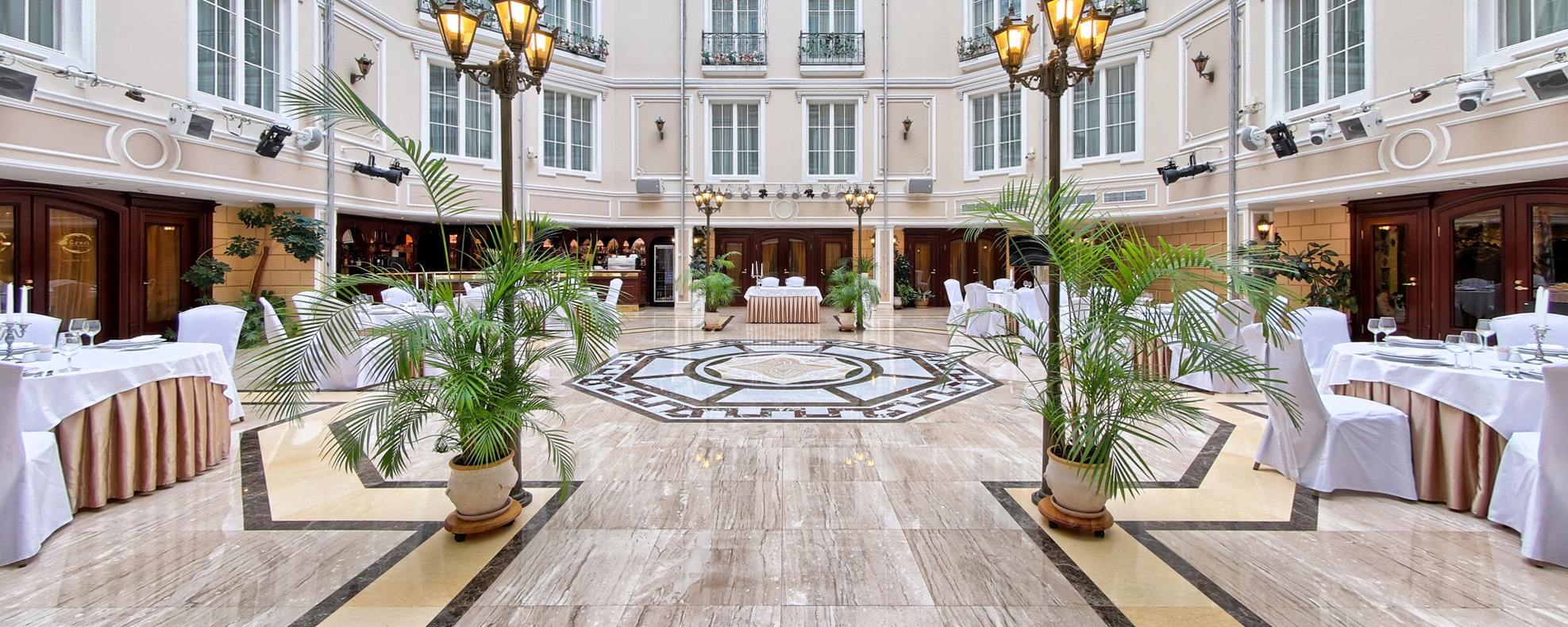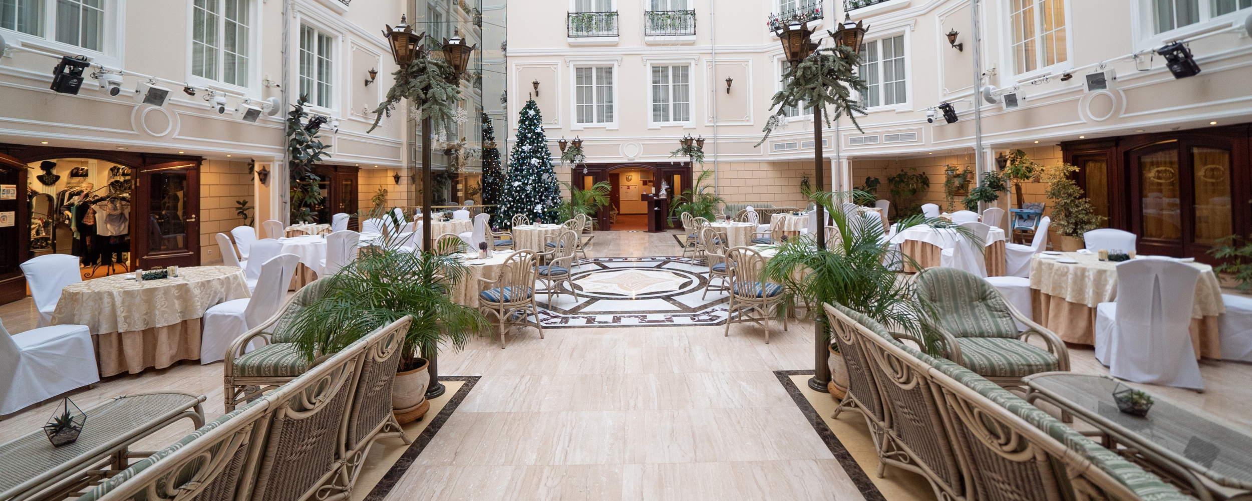 Внутренний дворик отеля с прозрачным стеклянным куполом крыши, большим количеством живых растений, выдержанным в тёплых тонах интерьером. Окна жилых номеров выходят в этот зал, поэтому у этой площадки есть временные и шумовые ограничения: мероприятие длится до 22:00.