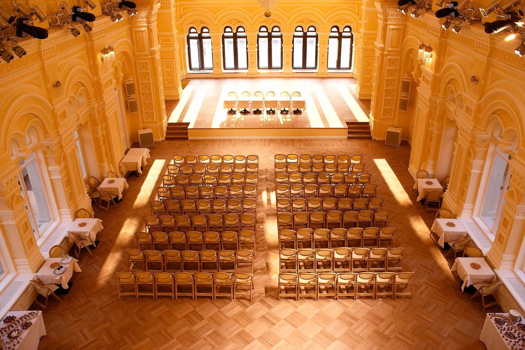 Общая площадь зала – 386 м2. Стационарная сцена – 10х10 м. Зал оборудован десятью акустическими системами, световым оборудованием для создания спецэффектов и заливного света, видеооборудованием, радиоуправляемым проекционным экраном.