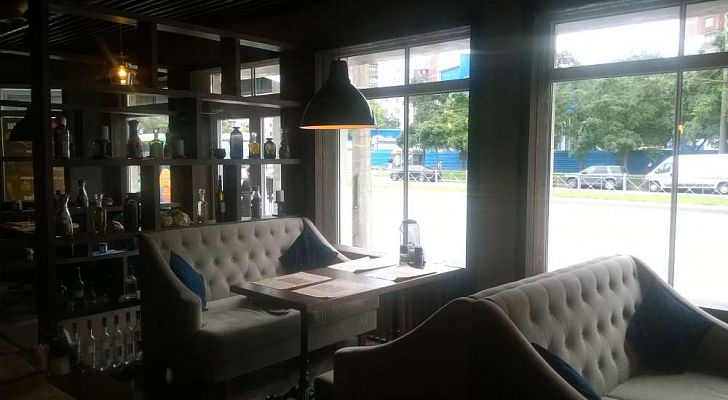 Интерьер представляет из себя уютный и просторный лофт. Диваны с обивкой приятного синего цвета, деревянные открытые шкафчики, объемные стеклянные светильники – ничего лишнего. На полках расставлена зелень, бутылки из-под настоящего грузинского вина и пива. Дизайн интерьера – полностью авторская разработка хозяев. Отдельного внимания заслуживает hand made барная стойка, выполненная из 356 деревянных брусков. Из таких мелочей выстроена главная идея заведения – экологичное отношение к окружающему миру.