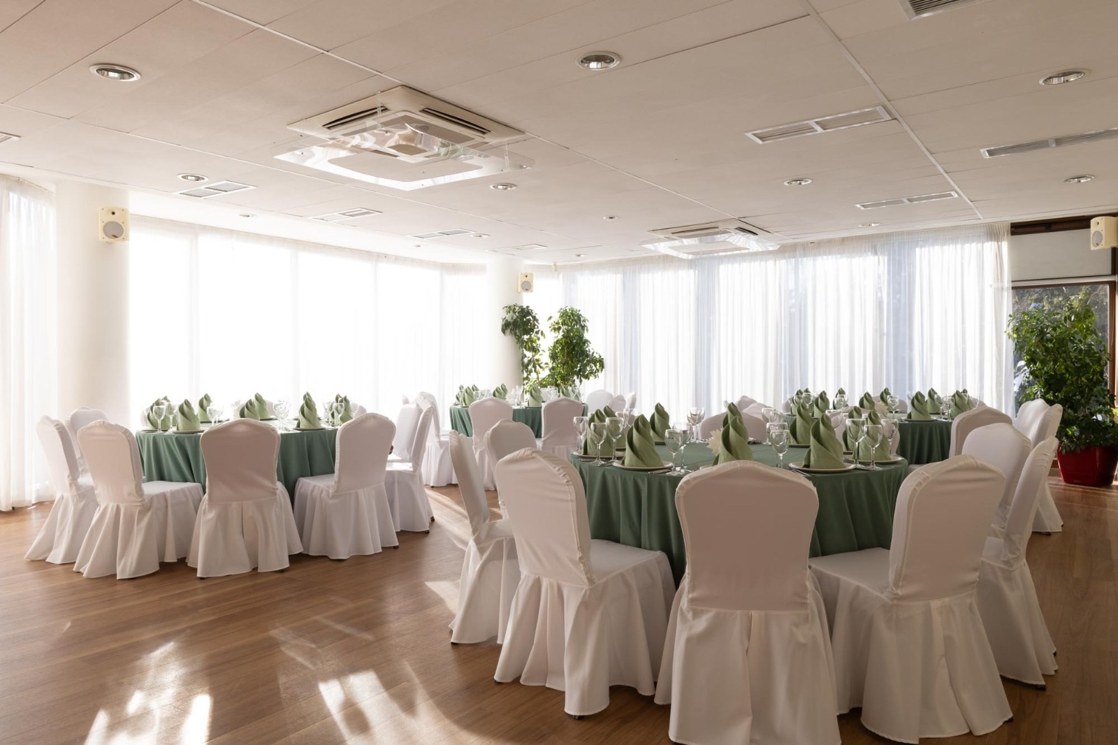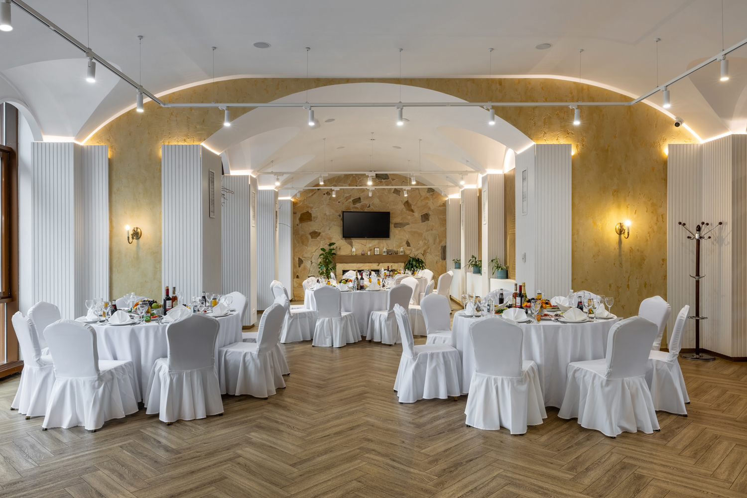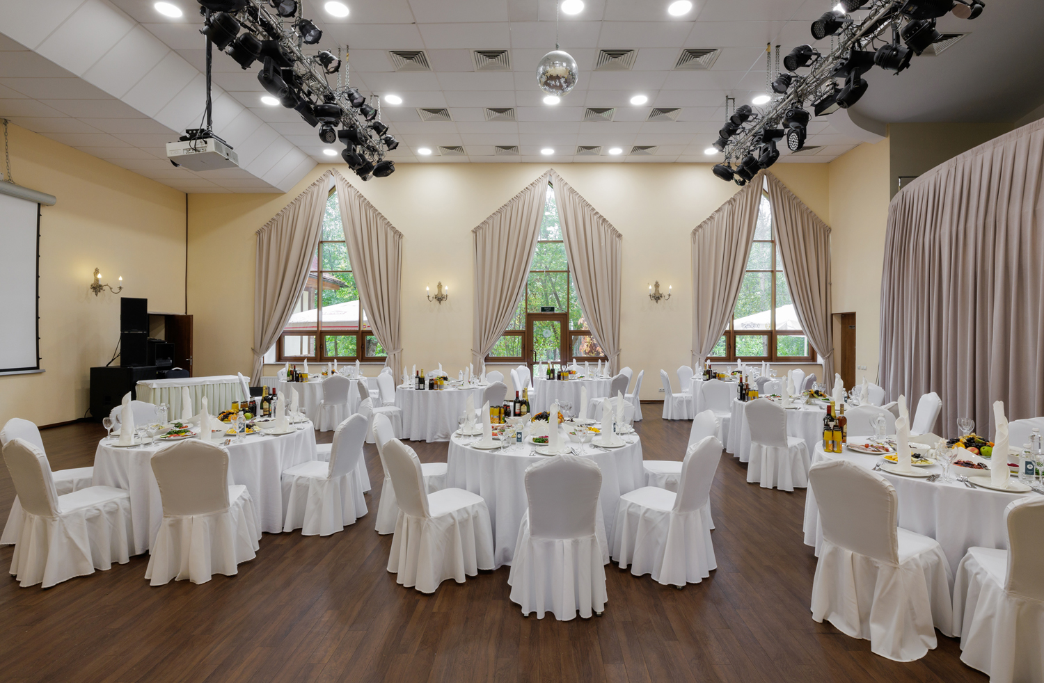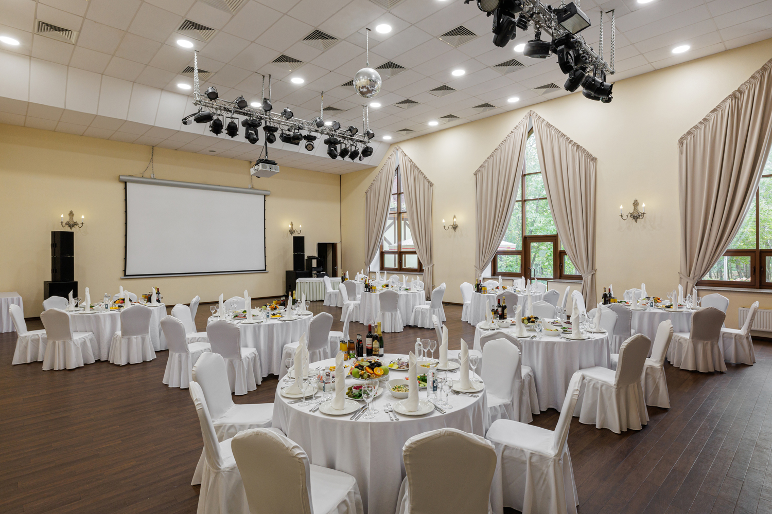 Зал универсален тем, что может использоваться под проведение как корпоративного мероприятия, так и банкета.