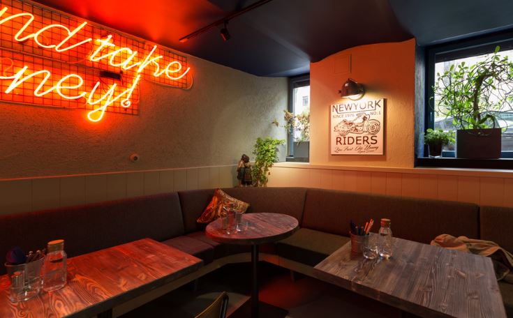 Небольшой зал обставлен лаконично, ноуютно. Гости могут расположиться намягких диванах попериметру или сесть законтактную барную стойку. Вкачестве декора используются плакаты сретро-мотоциклами, флаг Израиля игерой мультфильма«Футурама». Зеленые растения имягкое освещение создают расслабленную атмосферу, располагающую котдыху инеспешным беседам завкусной едой.