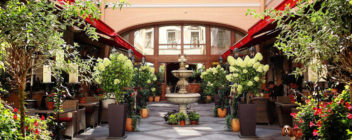 Заведение состоит из несколько залов-гостиных и атриума с декоративным фонтаном. Роскошный интерьер исключает любой намек на минимализм. Натуральная кожа и ковры, бархат, картины, дерево, хрусталь, бронза, лепнина на потолках – вечная классика и истинно дворцовый шик. Посуда с кобальтовой полосой, изготовленная на заказ «Императорским фарфоровым заводом», замечательно подходит бывшей гостиной архитектора императорского двора Андрея Ивановича Штакеншнейдера.