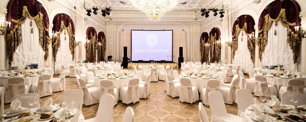 7 парадных залов Талион Империал Отеля в Санкт-Петербурге общей площадью 1386 м² и вместимостью от 8 до 400 гостей поистине уникальны. Оформленные в разных архитектурных стилях - французский ренессанс, барокко, рококо, классика, эклектика, ар-нуво – парадные залы «Талион Империал Отеля» позволяют организовать любое событие в изысканной дворцовой атмосфере.