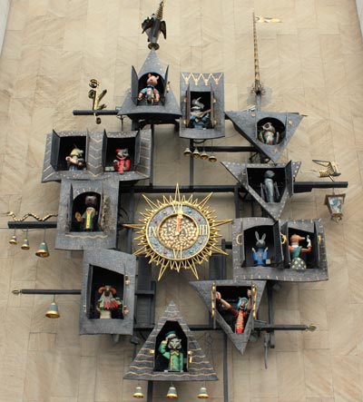 Металлические часы, украшающие фасад - "визитная карточка" театра. Каждый час поочередно открываются дверцы в домиках-ящичках вокруг циферблата часов и 12 сказочных персонажей под музыку "Во саду ли, в огороде" приветствуют всех, собравшихся перед театром. Одновременно всех животных можно увидеть только в полдень и в полночь.