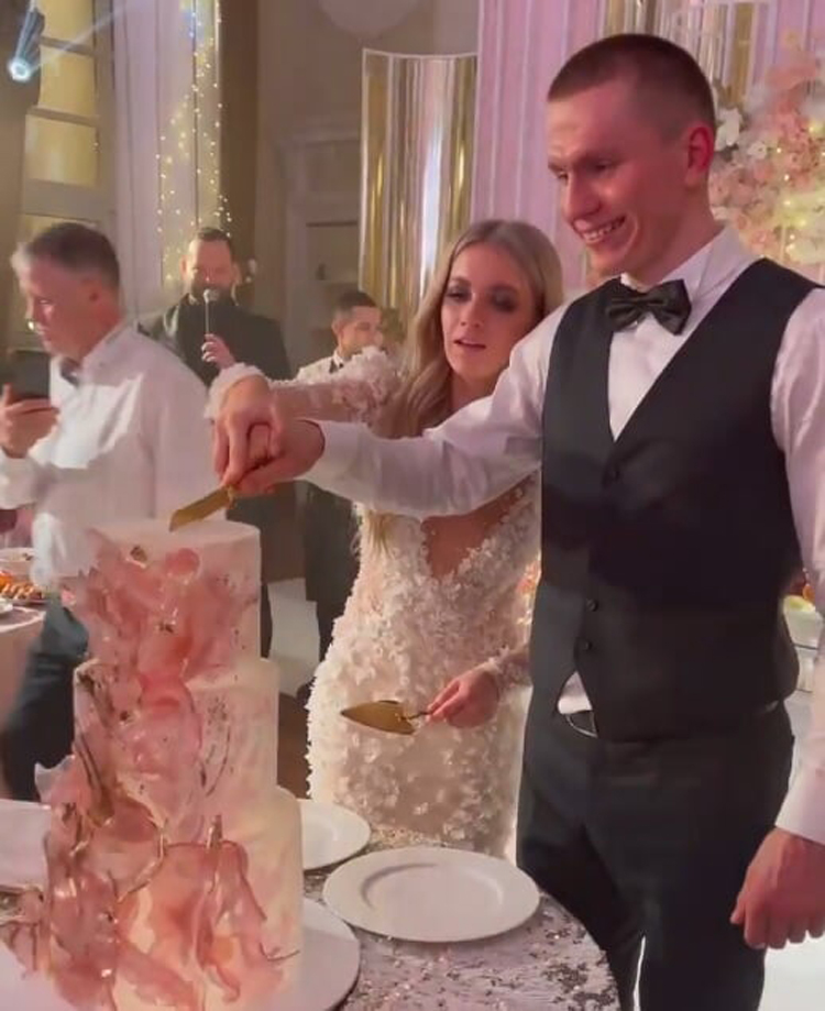 В конце торжества, как и положено, жених с невестой разрезали трёх-ярусный свадебный торт и одарили всех гостей кусочком этого изысканного десерта.