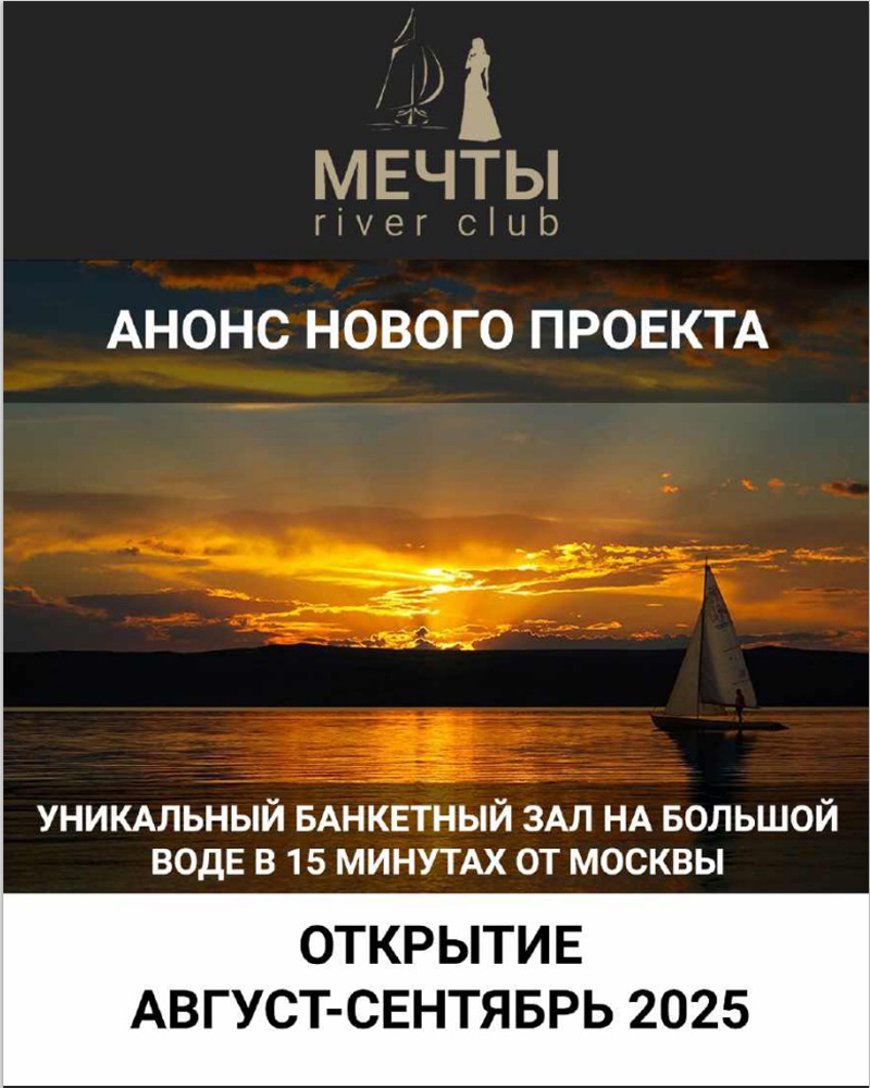 МЕЧТЫ river club – ваш идеальный корпоратив на воде! Откройте для себя место, где профессиональные встречи превращаются в незабываемые события! Скоро (август 2025!) на берегу Клязьминского водохранилища откроется самая атмосферная банкетная площадка — МЕЧТЫ river club.