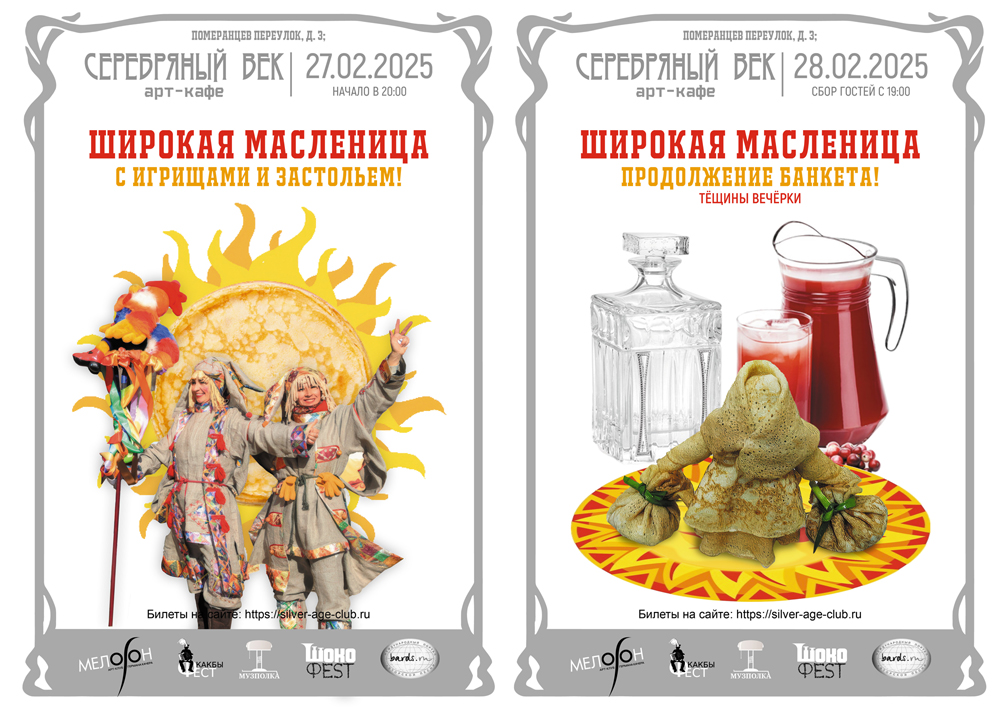 Ресторан русской кухни «Серебряный век» зовёт на Масленицу! Всю неделю у нас горы вкуснейших блинов, а по вечерам — аттракционы, забавы, танцы, конкурсы и выступления артистов! Успейте зарядиться праздником и вкусом!