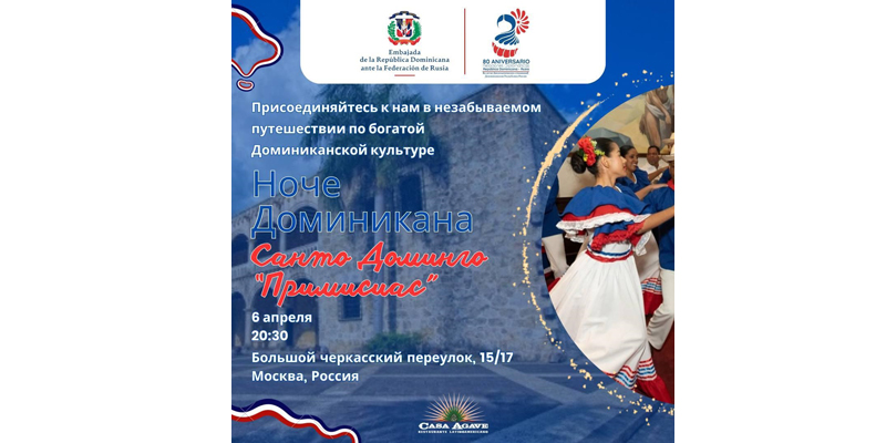 В воскресенье 6 апреля Доминиканская Вечеринка при поддержке посольства в Casa Agave. Начало в 20.00. Бесплатный вход. Мастер-класс по доминиканским танцам. Ждём всех!