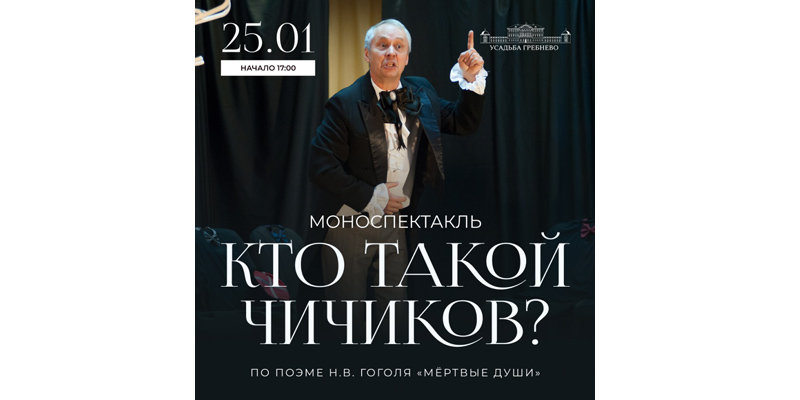 Приглашаем на невероятный МОНОСПЕКТАКЛЬ «Кто такой Чичиков?» по поэме Н. В. Гоголя «Мёртвые души», который пройдет в Трубецком Холле усадьбы Гребнево 25 января в 17:00.