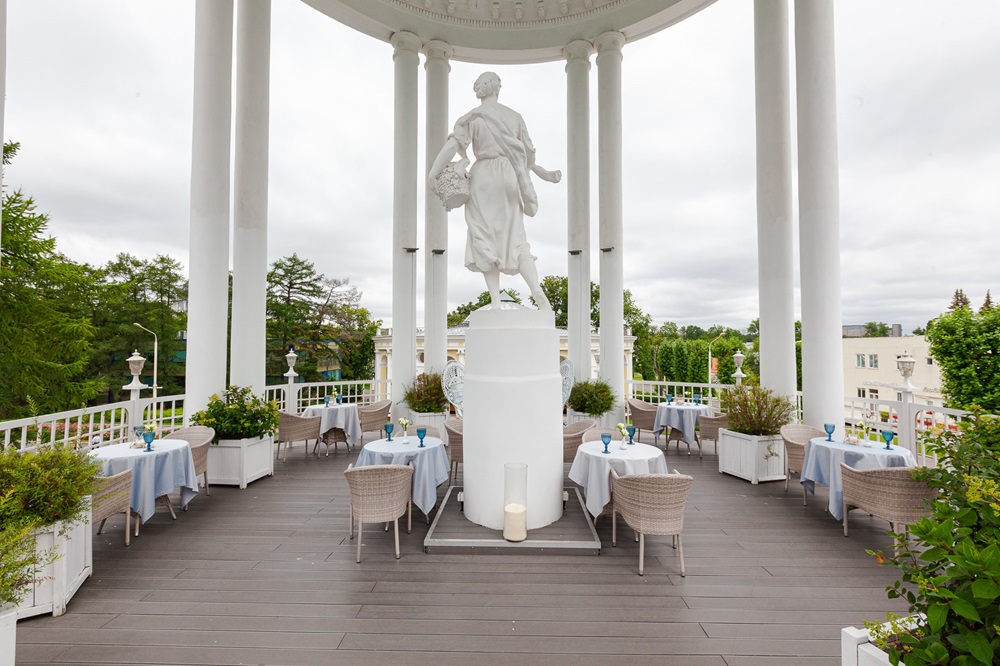 Наш ресторан — это белоснежное архитектурное великолепие сталинского ампира, воздушные интерьеры в небесно-голубых тонах и панорамные окна, открывающие вид на один из самых роскошных парков Москвы. Мы создаём атмосферу, которая трогательно возвращает в элегантную эпоху 50-х годов прошлого века, оставаясь актуальной для самого взыскательного гостя.