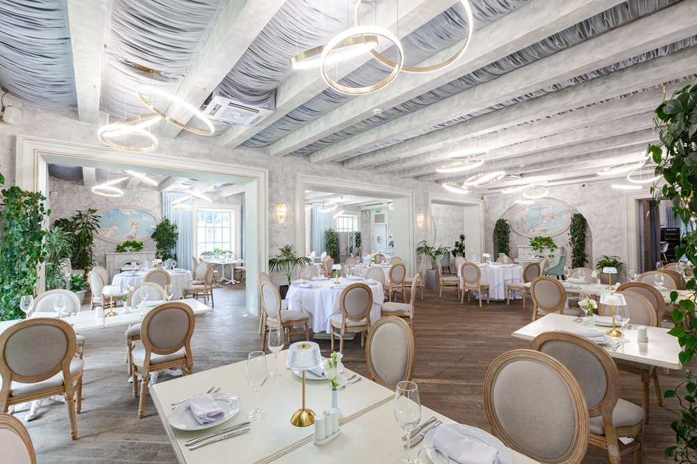Наш ресторан — это белоснежное архитектурное великолепие сталинского ампира, воздушные интерьеры в небесно-голубых тонах и панорамные окна, открывающие вид на один из самых роскошных парков Москвы. Мы создаём атмосферу, которая трогательно возвращает в элегантную эпоху 50-х годов прошлого века, оставаясь актуальной для самого взыскательного гостя.