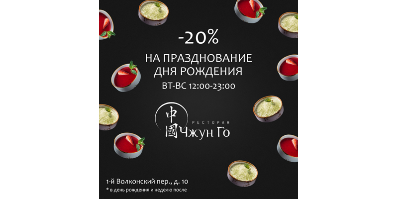 Ваш праздник — наш повод для радости! В честь вашего Дня рождения ресторан Чжун Го дарит вкуснейший десерт и скидку 20% на меню! Акция действует в День рождения и целую неделю после.