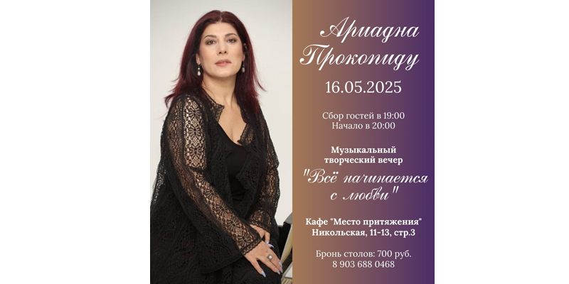 Дорогие друзья! Приглашаем вас 16 мая на творческий музыкальный вечер Ариадны Прокопиду "Всё начинается с любви" в кафе "Место притяжения".