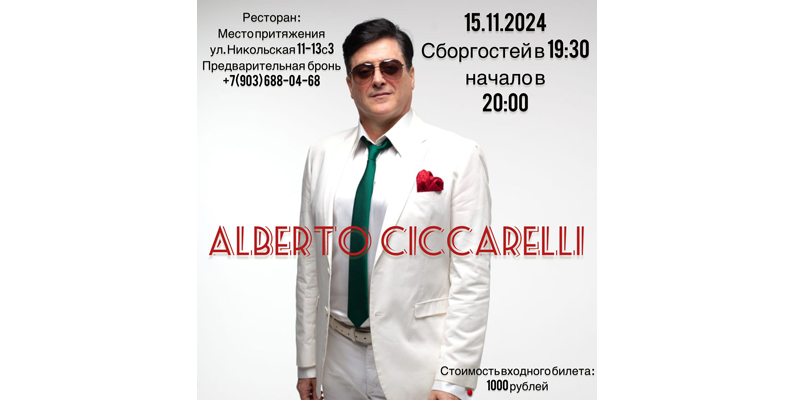 Альберто Чиккарелли — разносторонний певец, благодаря своему голосу с одинаковым успехом поет в разных жанрах и стилях. В программу концерта входят лучшие хиты популярной и классической итальянской музыки: танцевальные хиты, лирические композиции, романтические серенады, веселые песни из кинофильмов.