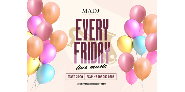 Каждую пятницу в ресторане Mady на Динамо для вас звучит потрясающая живая музыка! А ещё каждому имениннику мы дарим скидку 20% и бутылку игристого в подарок на празднование Дня рождения при предъявлении паспорта. Скидка распространяется на банкетное предложение с предзаказом. Для вас и ваших особенных событий зал ресторана с интерьером в стиле ар-деко и цветущая веранда.