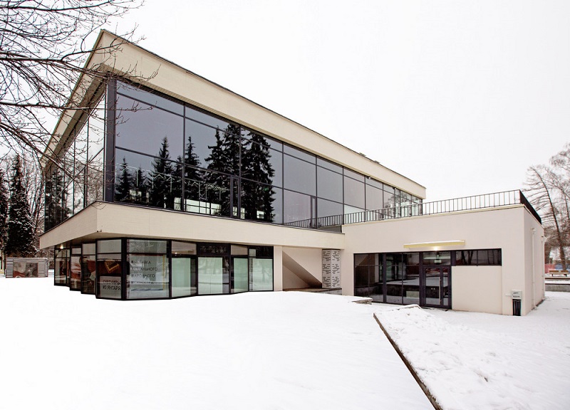 Светлое пространство с панорамными окнами и видом на заснеженный парк расположено в пяти минутах от Арки Главного входа ВДНХ.