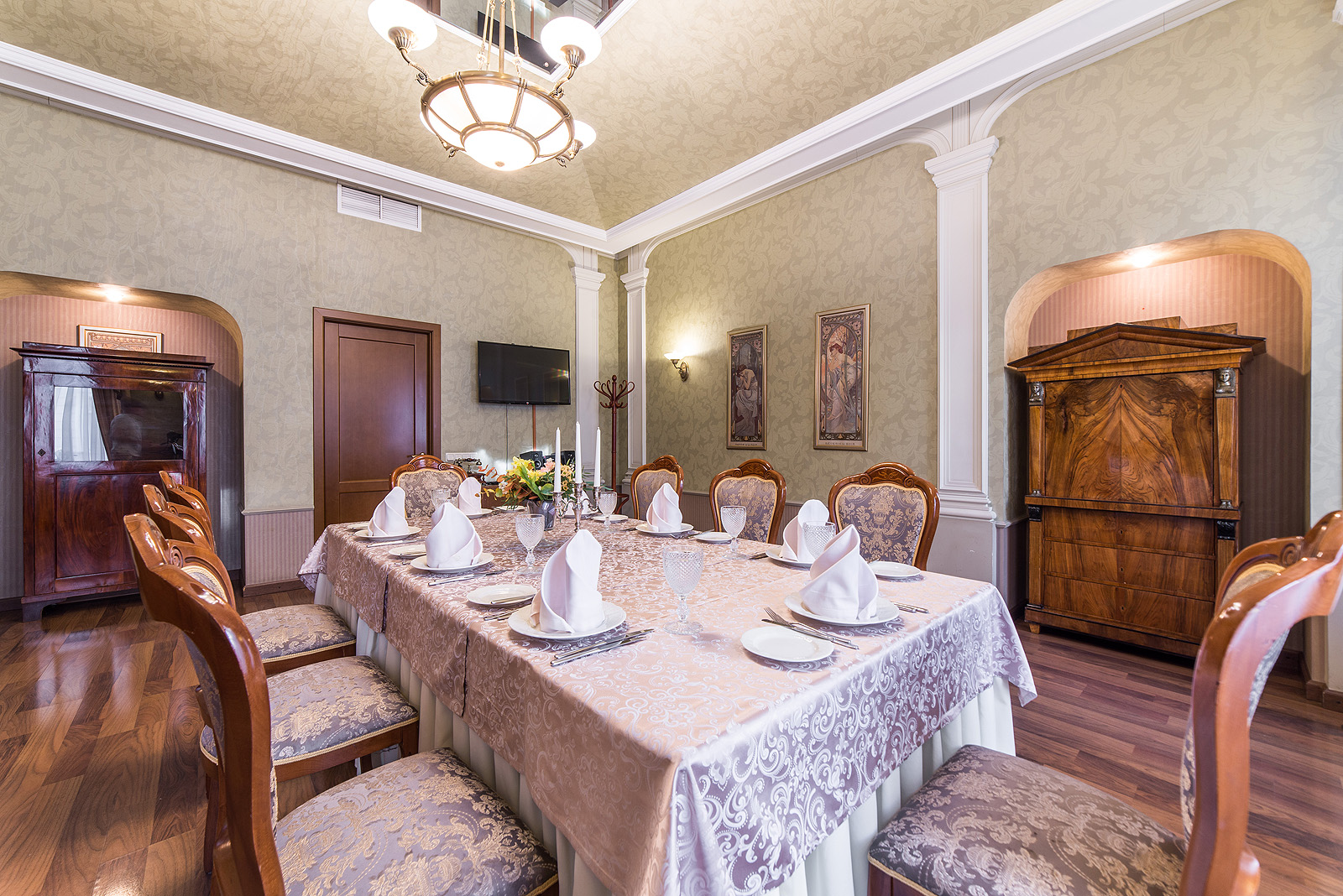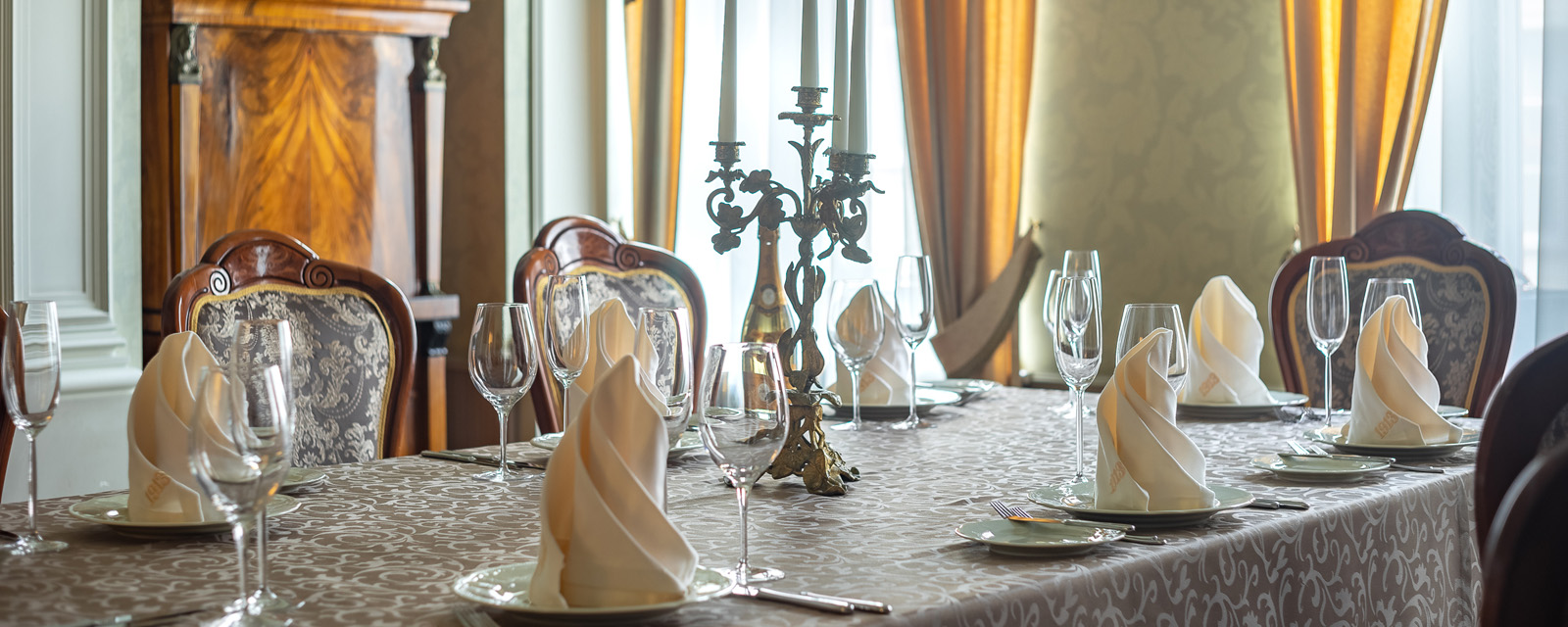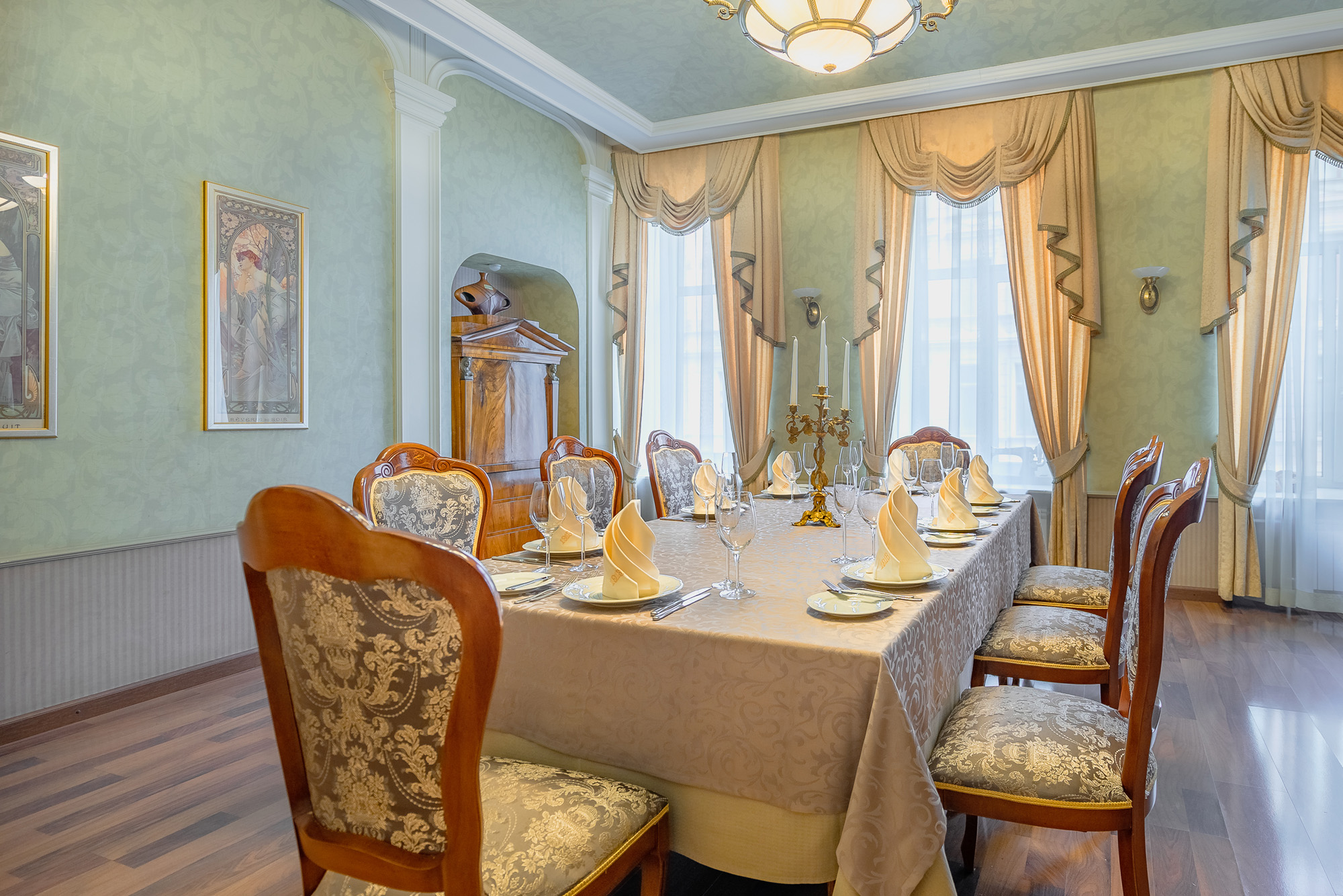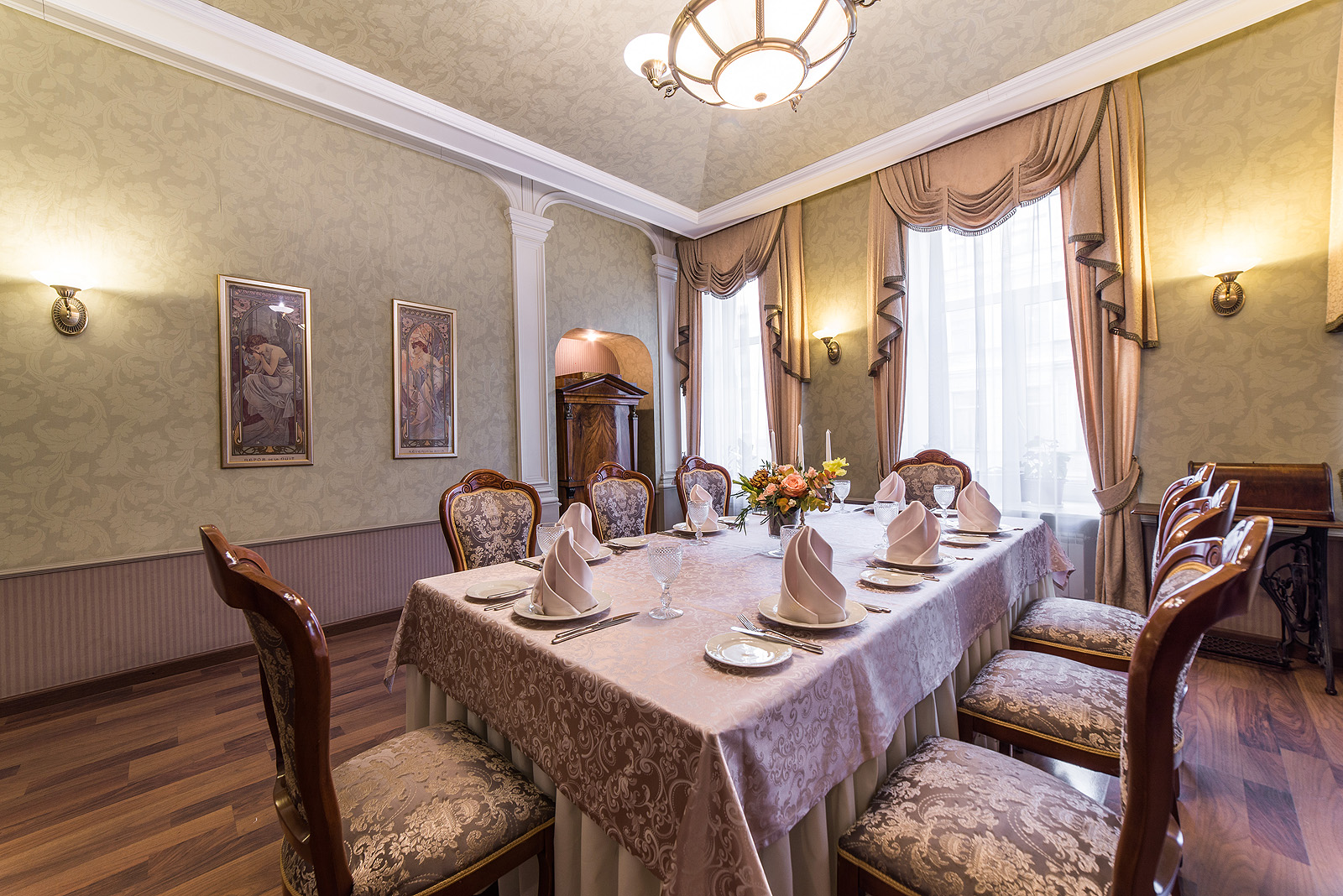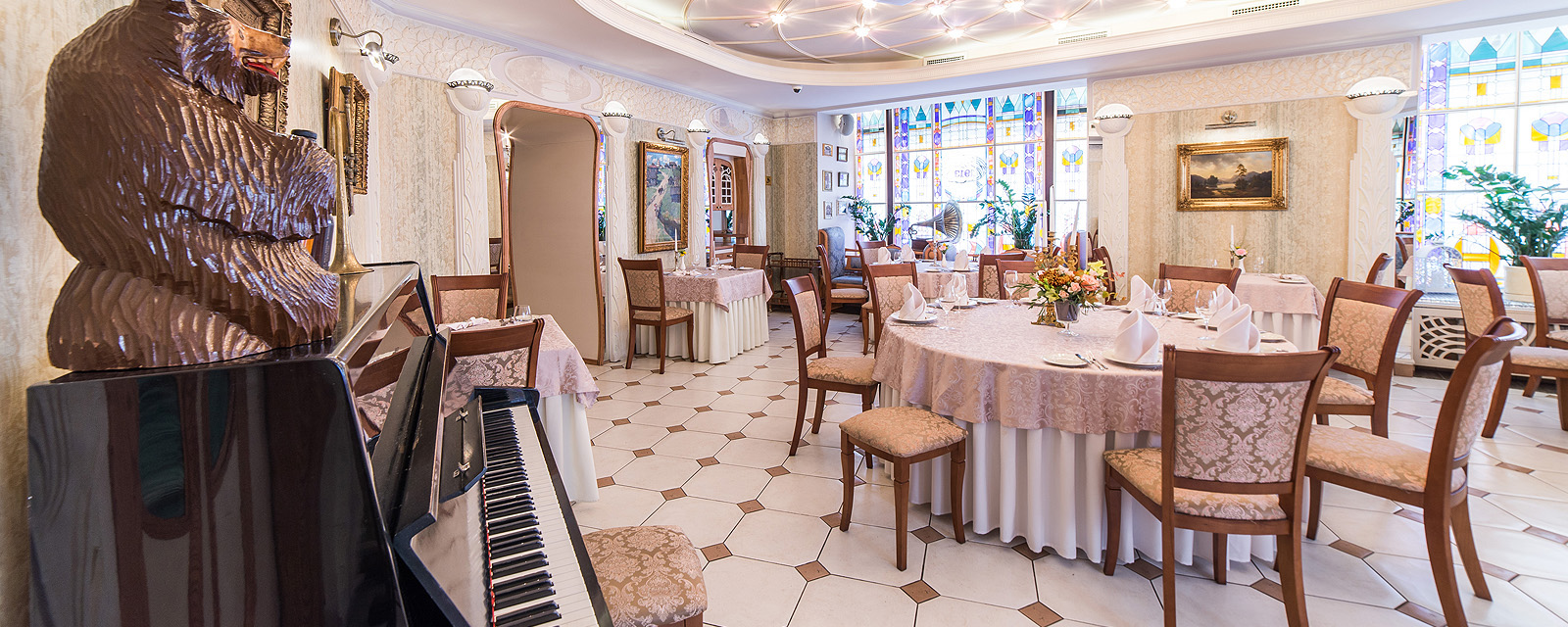 Ресторан 1913 на Вознесенском проспекте находится в центре исторического Петербурга при одноименном отеле. К услугам гостей три зала разной вместимости и дизайна, объединенные общим стилем ар-нуво с плавными линиями, гармоничной палитрой и роскошными витражами. Основной зал отличается парадной обстановкой и подходит для масштабных событий. В интерьере использованы антикварные предметы мебели и декора: часы, резные буфеты, вазы и подсвечники. Высокие окна украшают разноцветные витражи, стены — картины в золоченых рамах.
