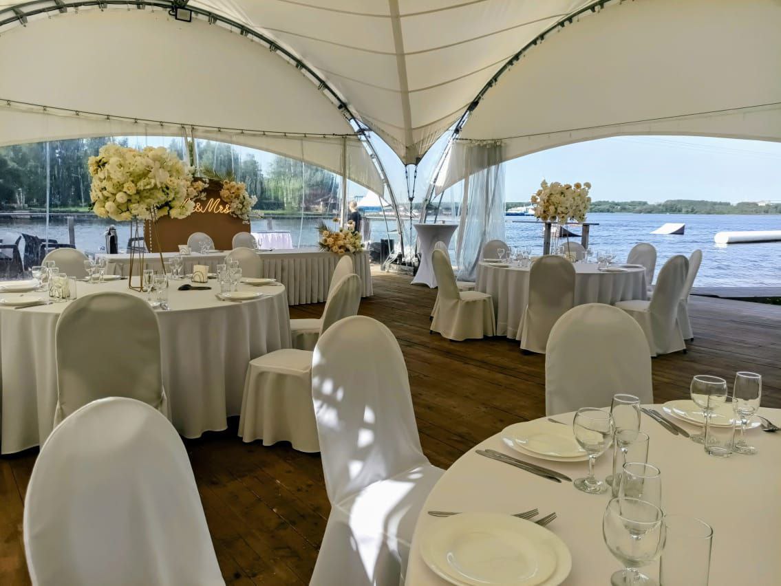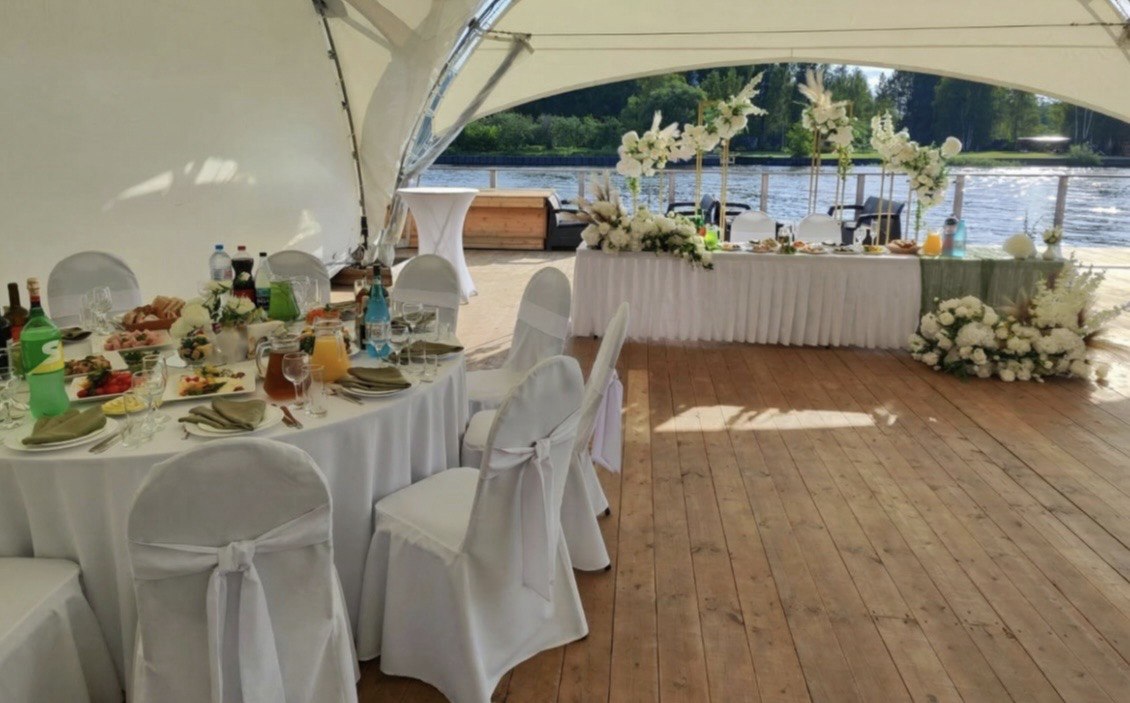 Белоснежный арочный шатёр с открытой верандой, расположенный в 11 км от Москвы, на берегу Клязьминского водохранилища, площадь шатра 200кв.м. (20х10м).