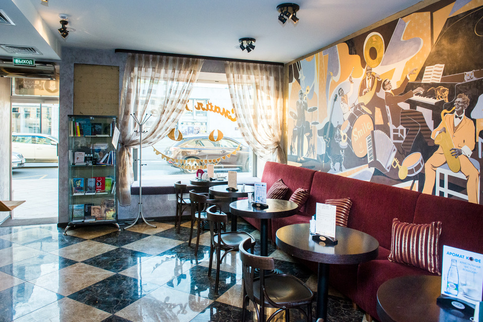Удобные диванчики, барная стойка иджазовая вакханалия вовсю стену. Каждому посетителю онполюбится чем-то своим. Уютным местом уокна… Или ярким разнообразием напитков вбаре… Аможет быть, неожиданно обнаружившейся печатной машинкой…