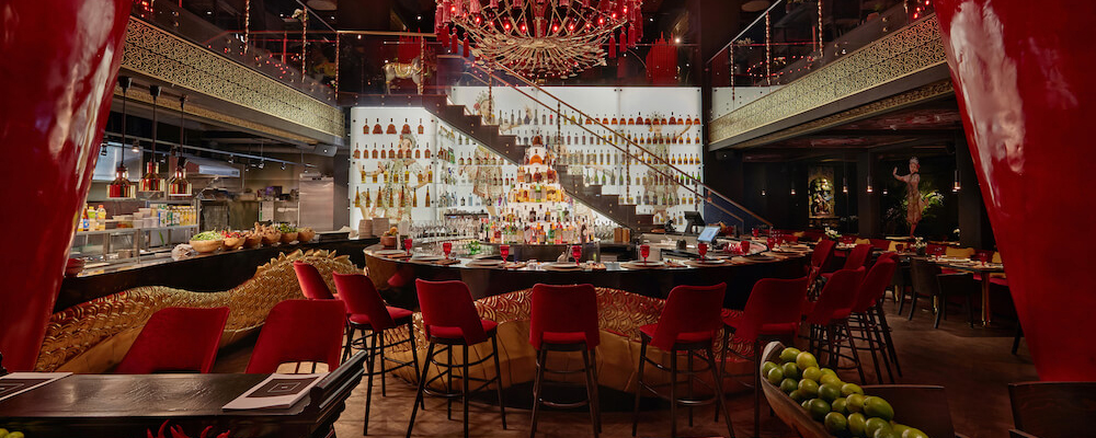 Архитектурному бюро Анастасии Панибратовой, известной в том числе по таким проектам, как “Доктор Живаго”, “Белуга” и оригинальный Black Thai, удалось создать для обновленного ресторана интерьер, похожий на лакированную восточную шкатулку, полную манящих чудес. Ресторан получился ярким, сочным, пряным, но очень современным. Прямо от входа открывается главная сцена: обрамленная необъятными алыми колоннами барная стойка в виде свернувшегося спиралью золотого дракона. На стенах исполняют затейливые па гиперреалистично изображенные тайские танцовщицы. Доминантой пространства стала старинная люстра гостиницы «Украина», декорированная в тайском стиле, а на антресолях разместилась «императорская ложа» - стол на двенадцать персон с двумя креслами-тронами. Насыщенная гамма красного, черного и золотого задает тон предвкушения торжественного праздника.