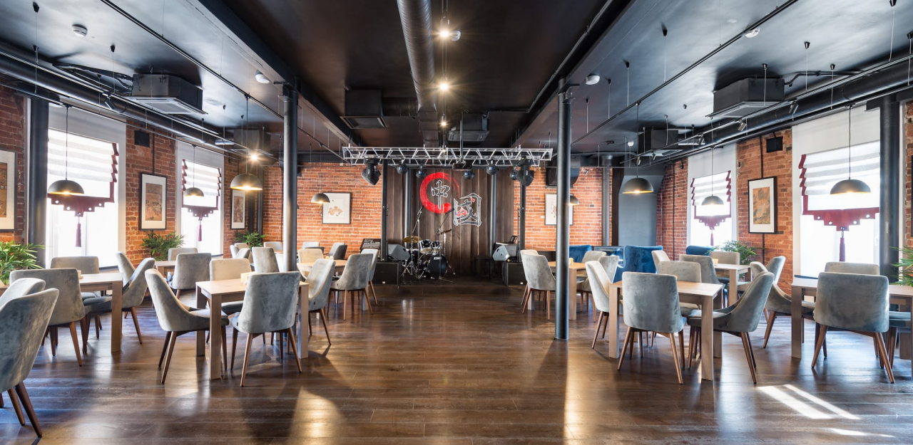 - Второй этаж (120 м²) — для банкетов от 20 до 60 человек.