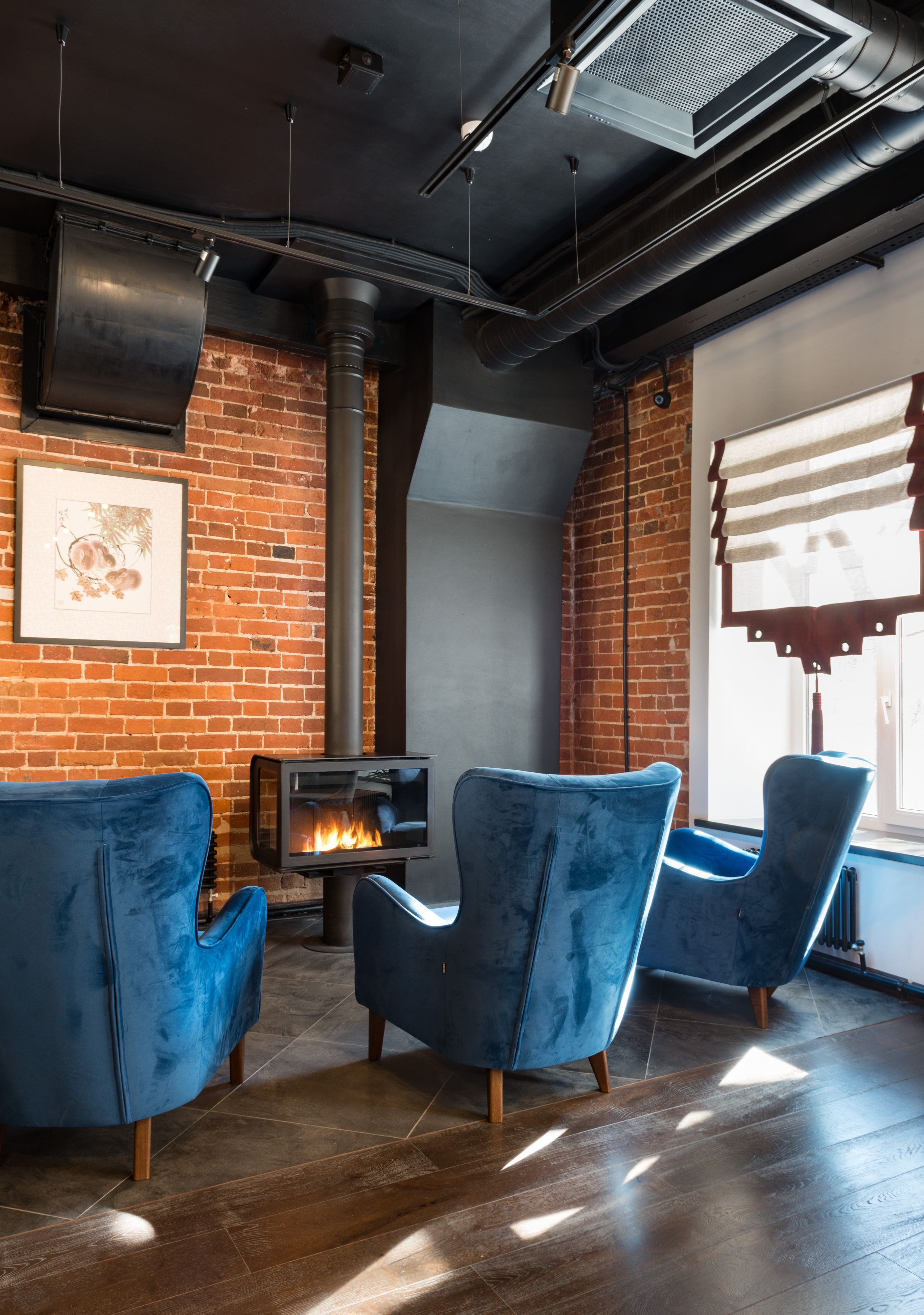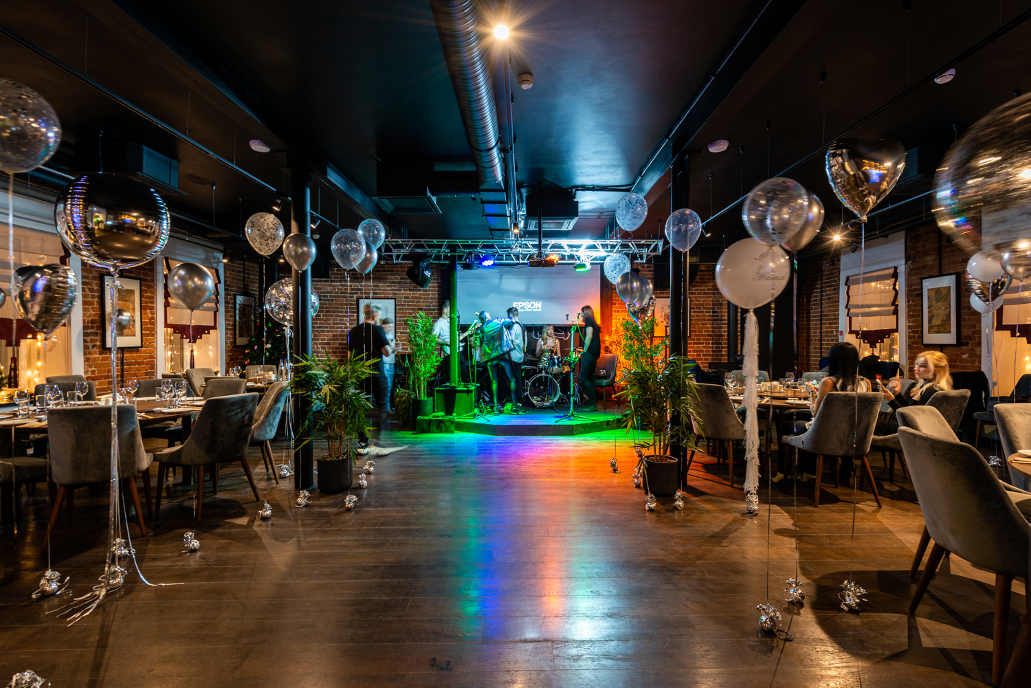 - Сцена, проектор, микрофоны и даже живой камин — чтобы ваш праздник стал незабываемым.