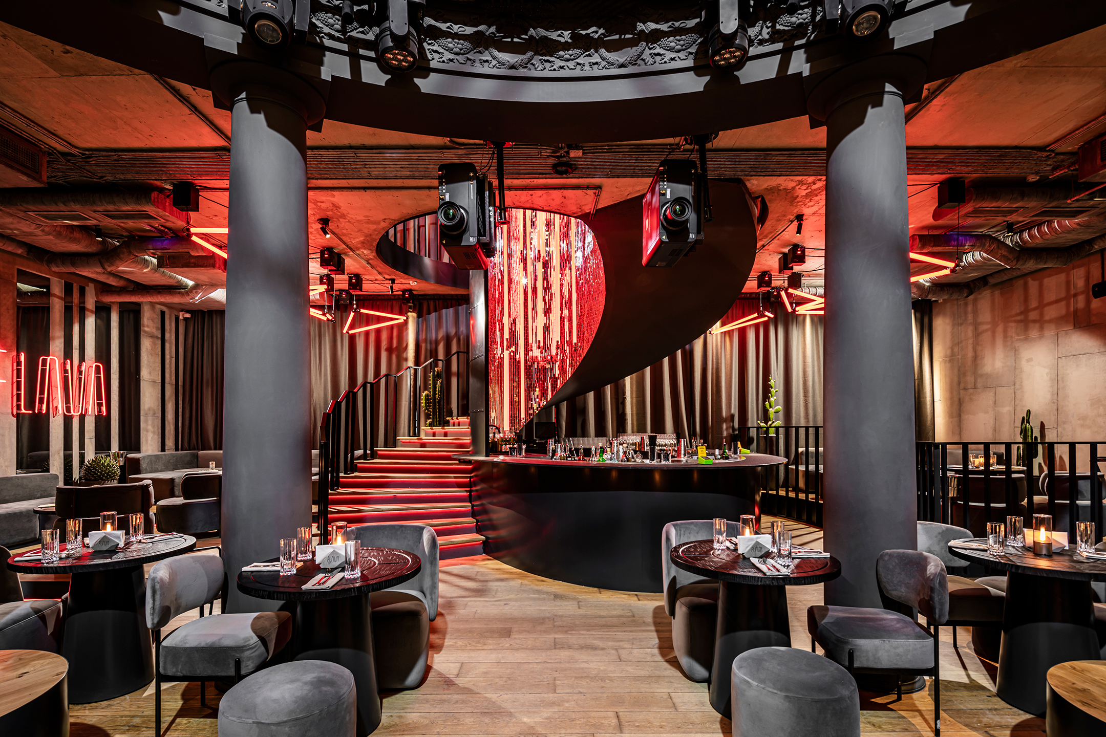 Расположившись в бывшем старинном особняке на Садово-Кудринской, Flava Event Dom сочетает в себе атмосферу роскоши и изыска с неиссякаемой энергией модных и современных танцполов. Двухуровневое пространство с высокими колоннами и театральными ложами дополняет современный дизайн в стиле лофт с минималистичными серыми диванами, неоновыми надписями и обилием дизайнерских световых конструкций.