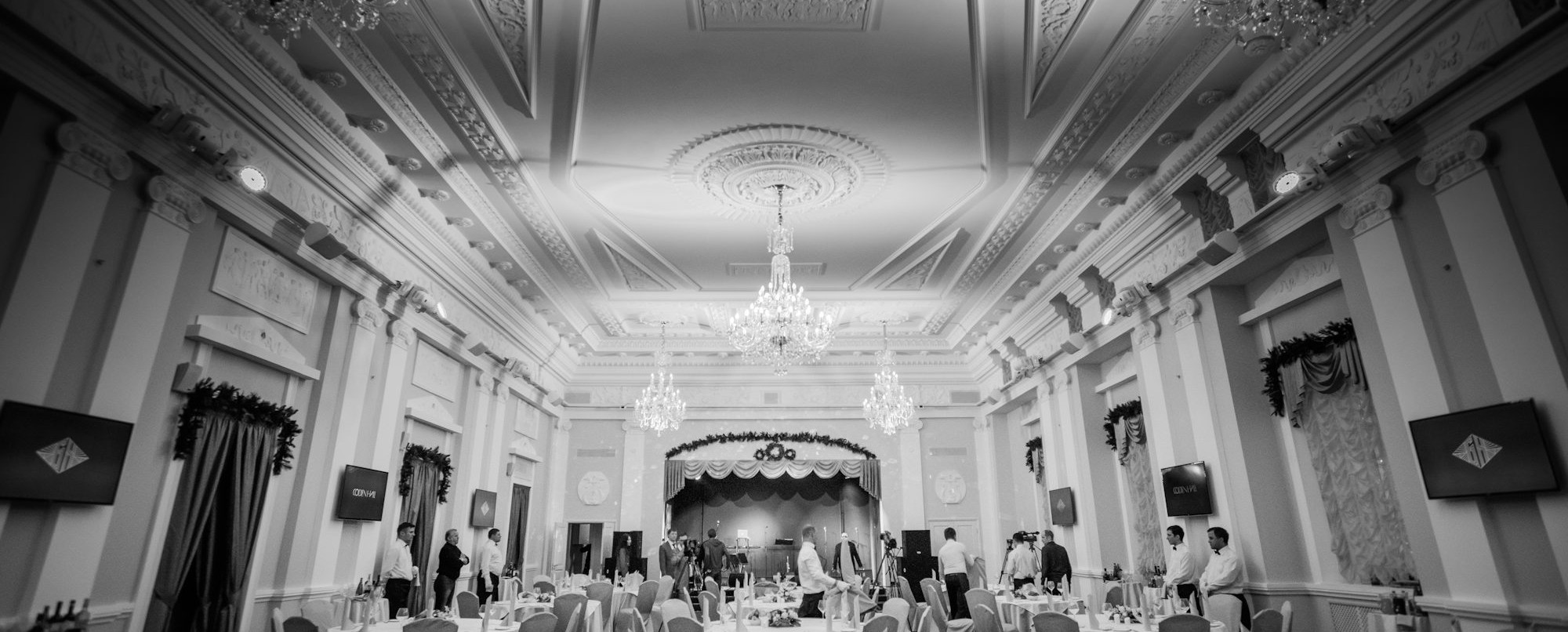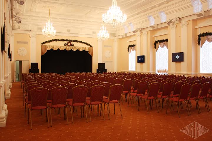 В зале установлена сцена 4 на 6,5 метров, при необходимости подключается 15 КВТ звука и профессиональное концертное освещение, а так же 8 мониторов для трансляций.