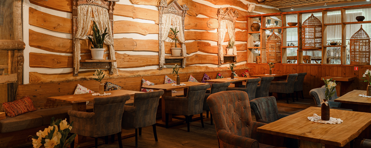 Интерьер и меню в духе русских сказок: бревенчатые стены, щучья уха, старинная утварь, рыба из коптильни, русская печь и панорамный вид на город.