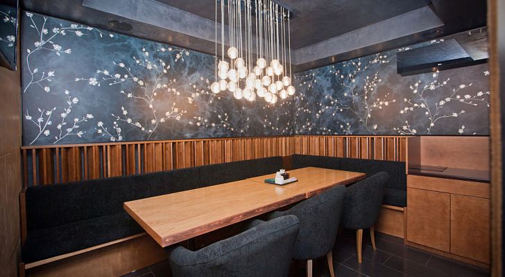 Пространство кафе «И Рис» на Ропшинской улице пронизано эстетикой японской и китайской философии обустройства интерьера, не переставая при этом быть местом исключительно петербургским по духу и ауре. Этот удивительный и гармоничный симбиоз воплощается в изящном и сдержанном облике залов кафе. Это союз архитектуры с равновесными и четкими линиями, идеального сочетания цветов - золотого, светлого дерева, черного, серого и белого, и фактуры, складывающейся из естественных, приятных на вид и на ощупь материалов. Добавляется к этому и особый ритм форм - стройные золотые стволы бамбука с кольцами роста повторяются в легких балюстрадах, отделяющих столики с аккуратными диванчиками друг от друга, и в золотистых же собранных из колец и конусов или черных, прямо имитирующих срезанный стебель светильниках. А в малом зале гроздь светящихся шаров кажется продолжением и плодом ветвей сакуры, расцветающих на стенах.