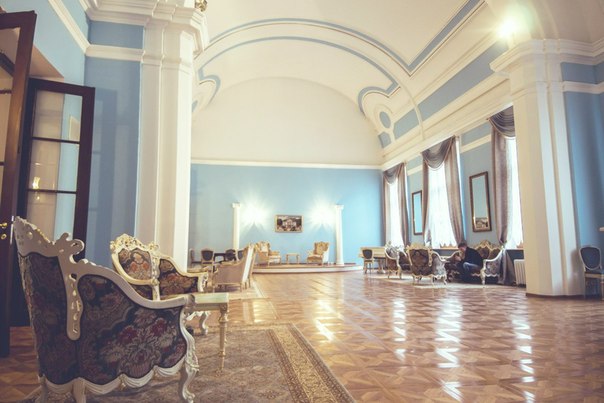 Просторный светлый зал для концертов, выставок, творческих встреч. Барочные диваны и кресла с гобеленами, большие зеркала и белый рояль создают эффект путешествия во времени в позапрошлый век.