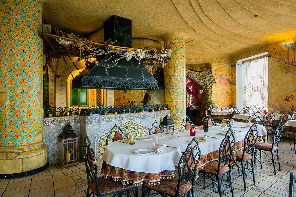 Наслаждаться богатством вкусов особенно приятно в обстановке южного дворика с его каменной кладкой и кованой мебелью под неумолчное журчание ручейка. Расположиться с комфортом так и зовут уютные кабинки с диванами. А VIP-зал ресторана - это роскошные покои с коврами и мягкими подушками, где можно понежиться в уединении или обсудить важные вопросы тет-а-тет. Уникальный интерьер "Каравана" - витражи, роспись потолка и стен, резьба по дереву - хранит неповторимый восточный шарм.