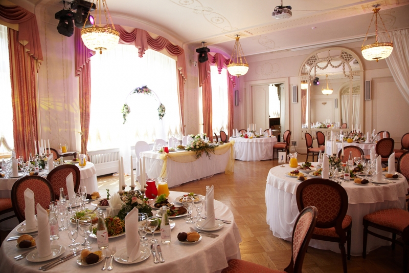 Для камерных семейных мероприятий подойдет белое фойе. Небольшой зал в кремово-бежевых тонах, освещенный старинными люстрами, также используется как музыкальная и танцевальная зона.