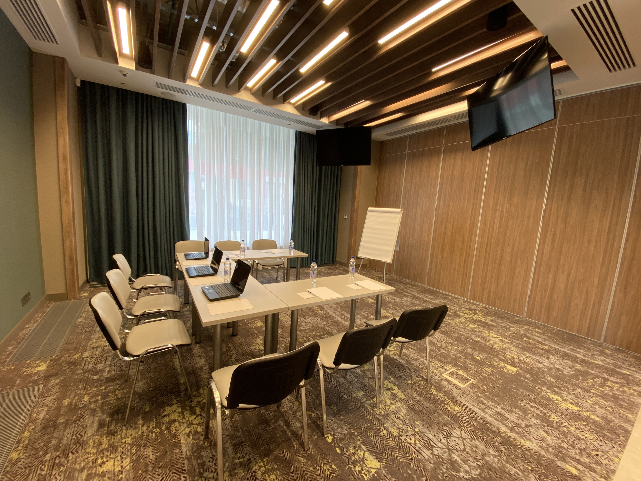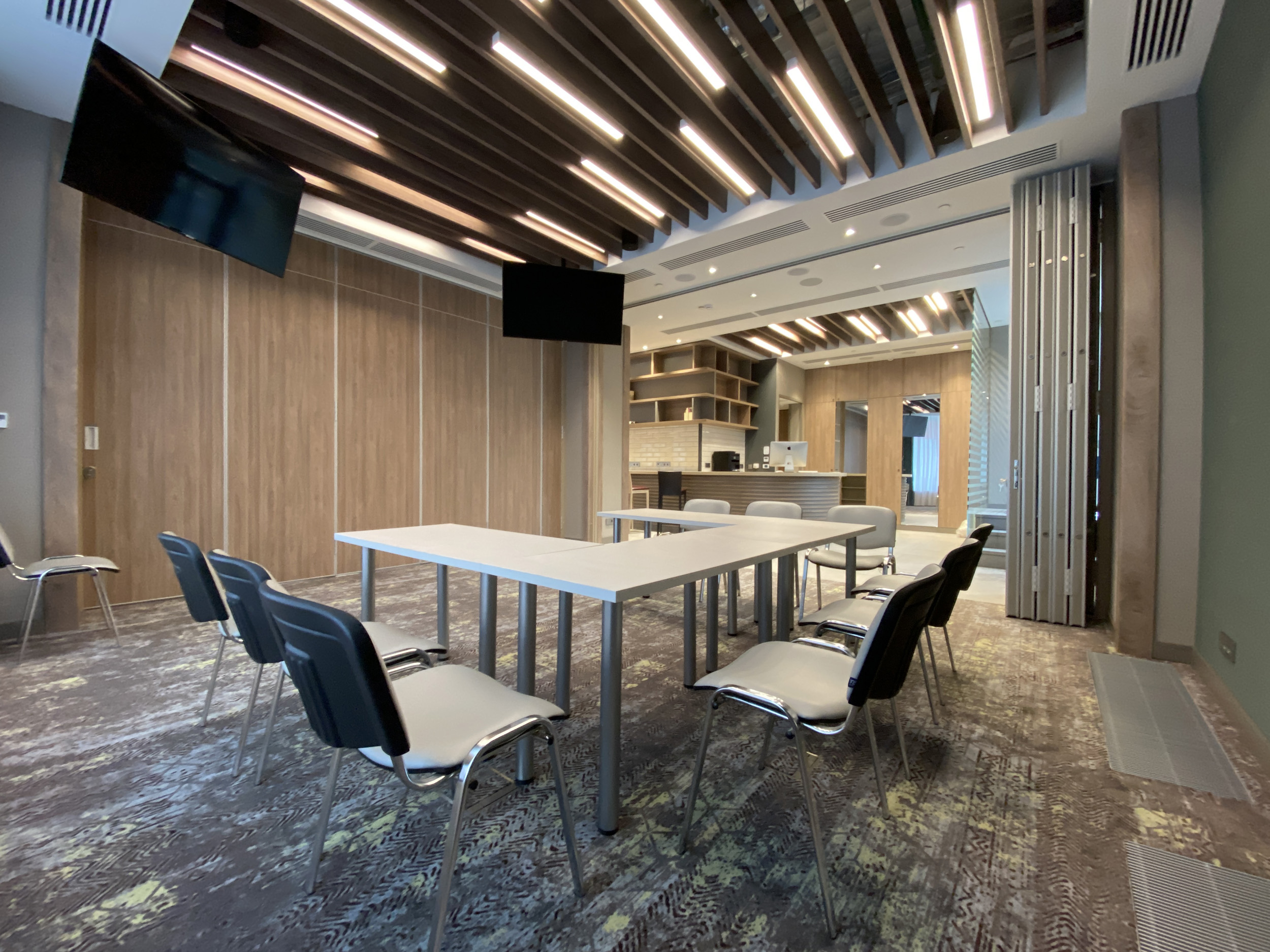 Имеется стильная зона ресепшен, функциональная зона для фуршетной линейки и организации кофе-брейков.