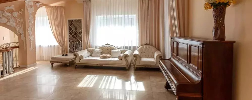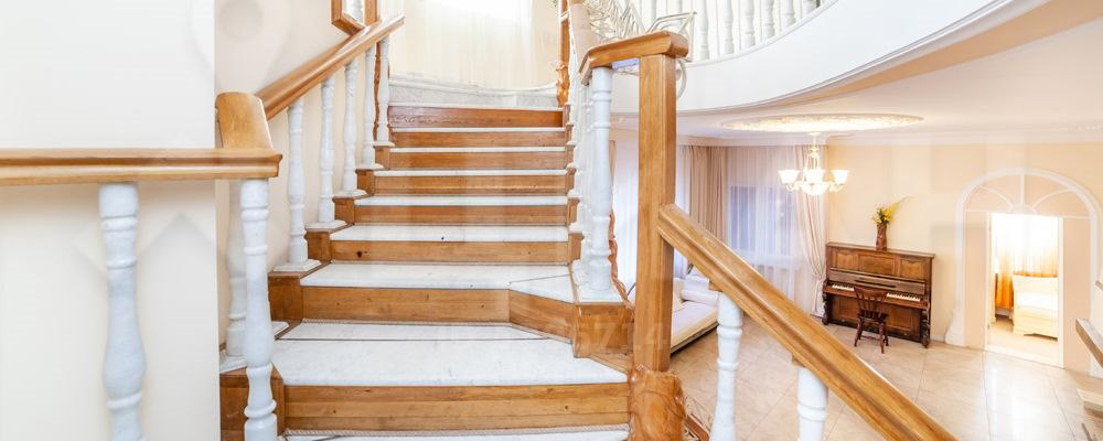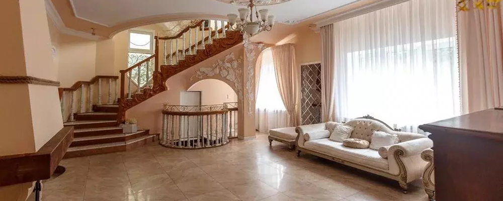 • Авторский дизайн интерьеров – широкая лестница из мрамора, редкие породы дерева, лепнина, эксклюзивная мебель.