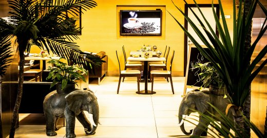 Интерьер бара с легкостью описывается двумя словами – дорого и сдержанно. Цветовая гамма контрастна: мебель темных тонов четко выделяется на фоне светлых стен, пола и потолка. Для того чтоб несколько оживить интерьер, повсюду в помещении расставлены комнатные растения. Элементов декора в лобби баре немного: картины на стенах, раритетные часы, вазоны для цветов в форме слонов, да крокодил, выгравированный на стеклянной перегородке. Со вкусом и не наляписто.