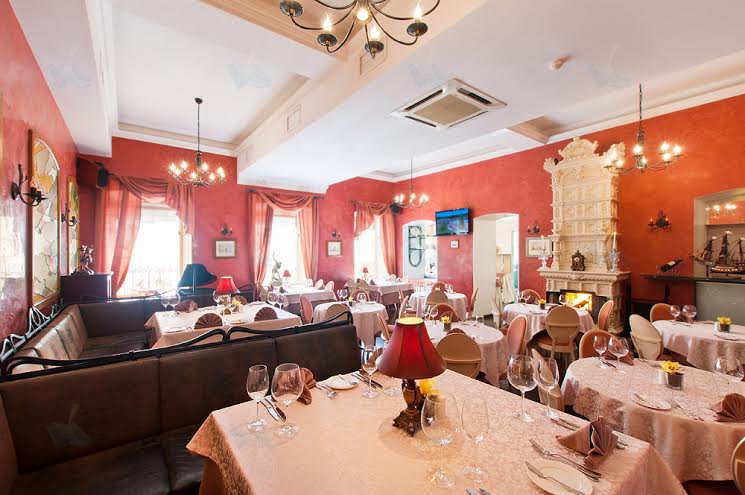 Классический интерьер с удобной мебелью дополняет изразцовый камин постройки XIXв., тематические скульптуры, черный рояль, оригинальные витражи и картины на широких стенах. Меню смешанной кухни и детское меню разнообразно. Карта вин, также как чайная и десертная, пестрит элитными напитками.