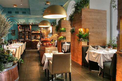 Интерьер ресторана обыгрывает тему вечного дуализма: горячее и холодное, черное и белое, свет и тьма. «Мясная» часть ресторана (первый и второй этажи) отделана в черно-красной гамме, здесь царит полумрак, в центре внимания - открытый гриль, на котором с умопомрачительным запахом обжаривается мясо. На стороне света выступает рыбная половина, оформленная натуральными материалами в светлых тонах; «рыбный» зал располагается на самом высоком, третьем уровне.