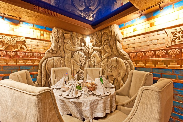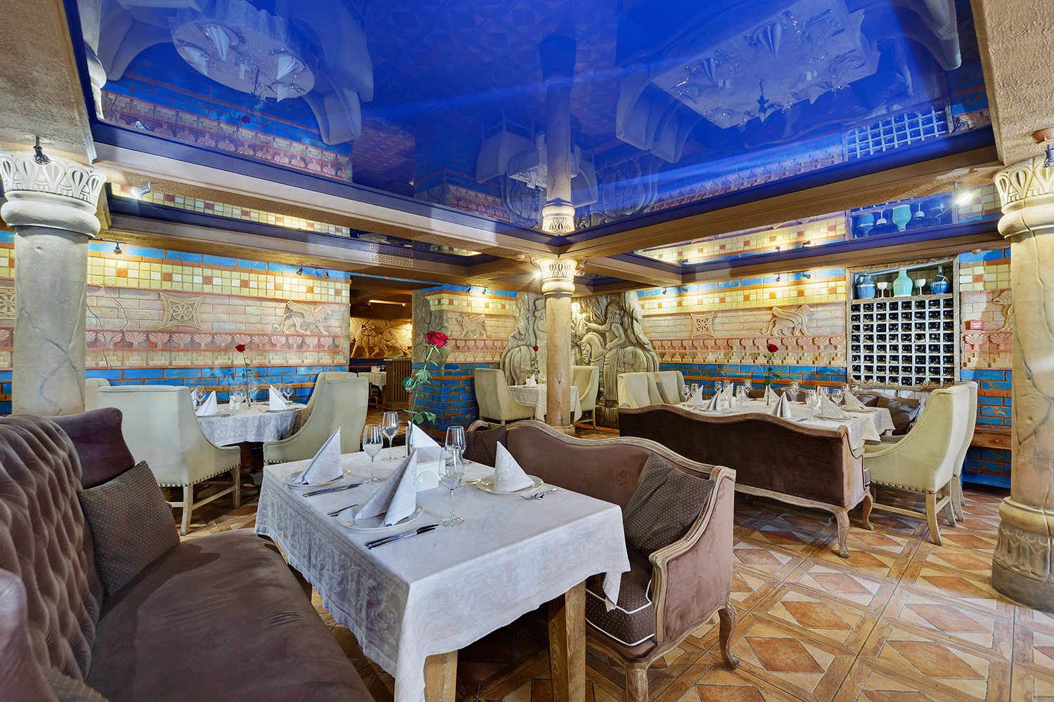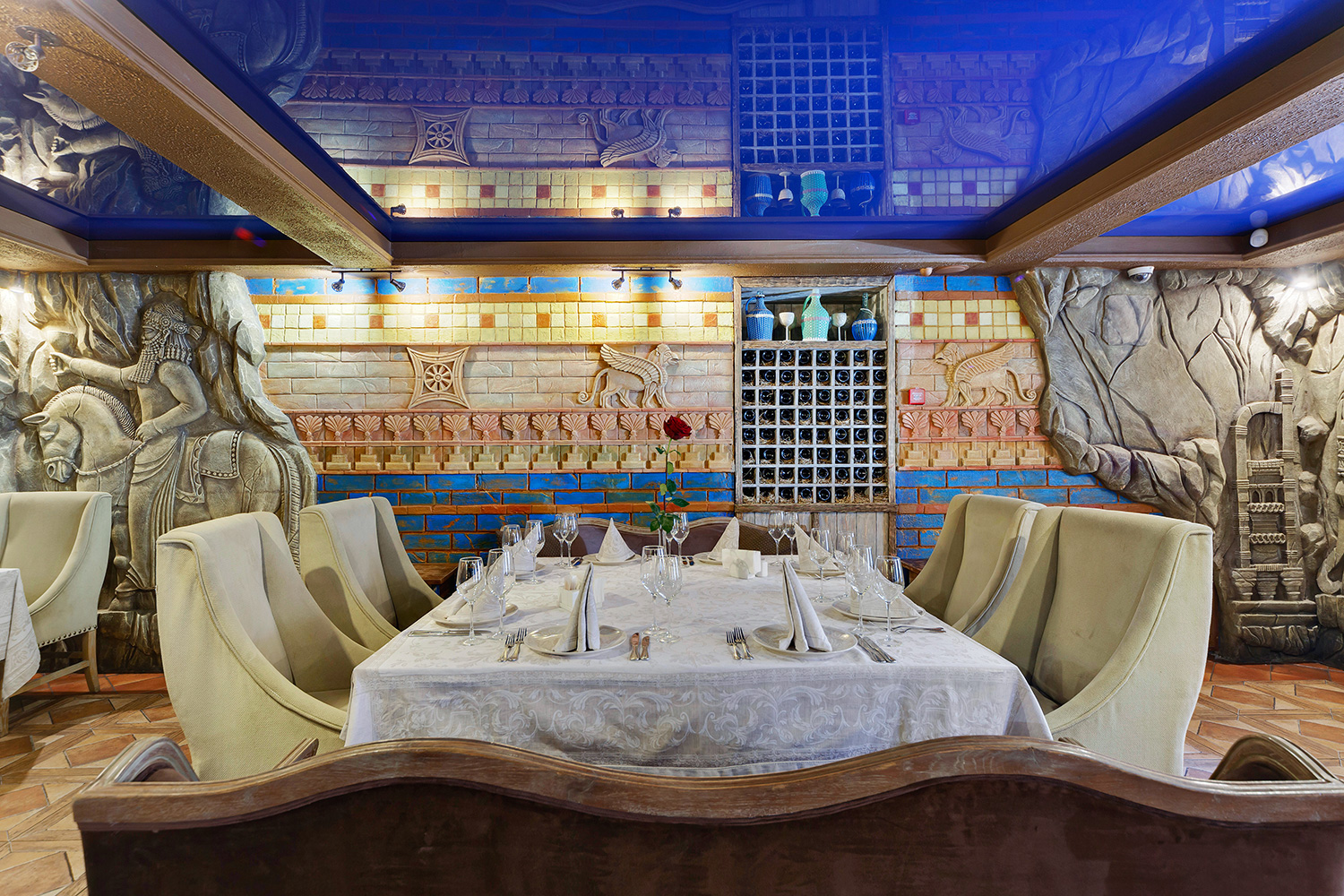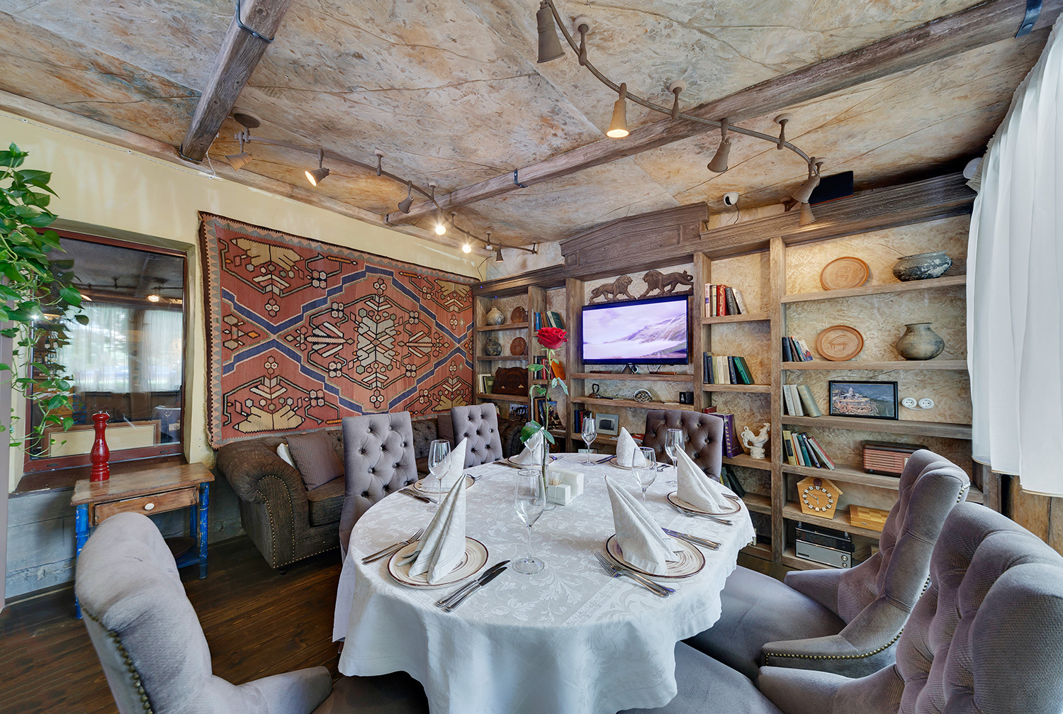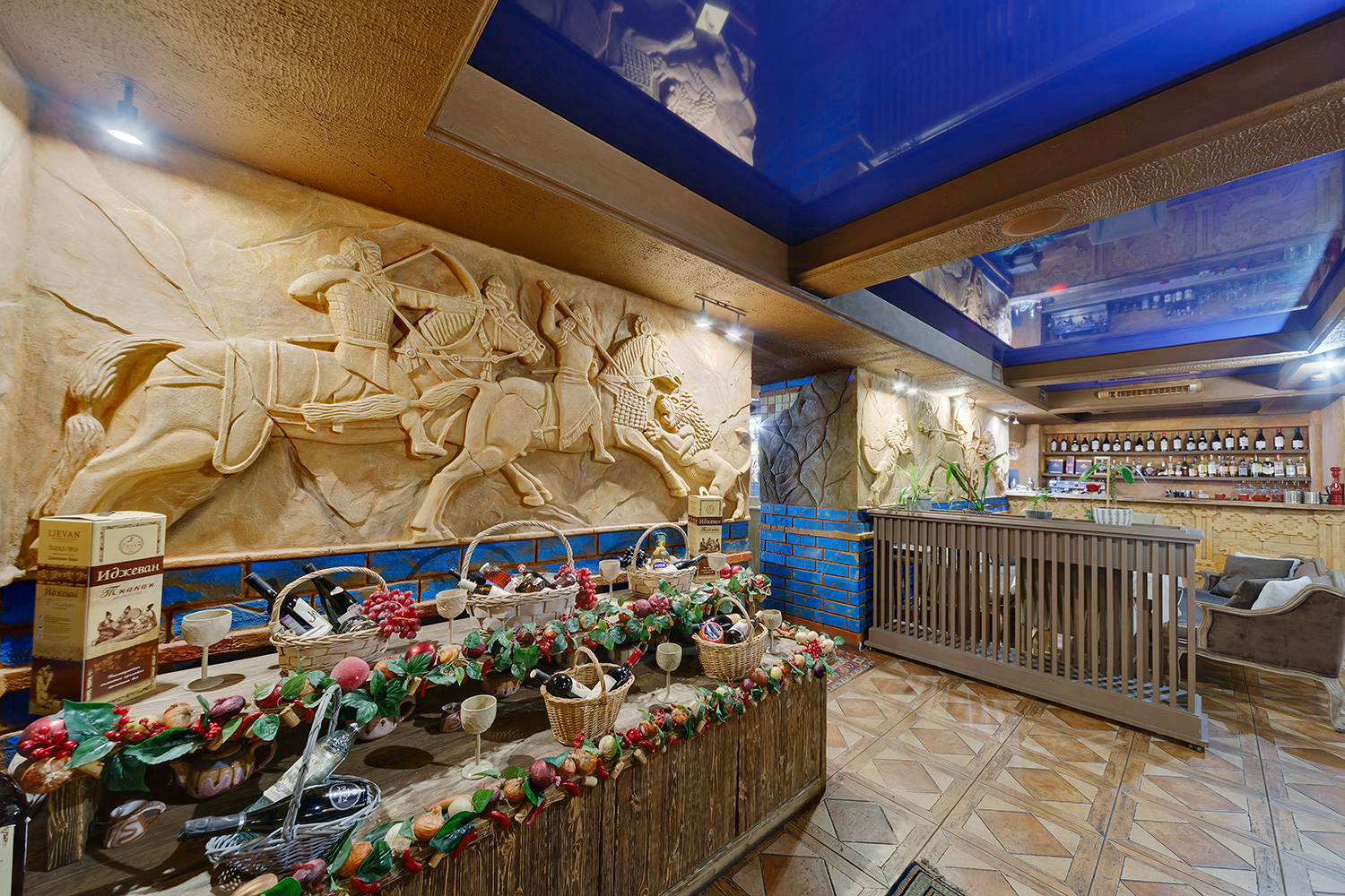 Интерьер ресторана полностью олицетворяет культуру Армении. На стенах - точная копия барельефов крепости Эребуни (Ереван). Уютную атмосферу создают мягкие диваны, эксклюзивные скатерти, посуда ручной работы и обивка мебели из бархатной ткани традиционного армянского цвета. Ресторан состоит из двух залов: основной и малый (с баром, открытой кухней и лавкой армянских продуктов), а также уютной всесезонной террасы с большими окнами, цветами и атрибутами древней Армении.