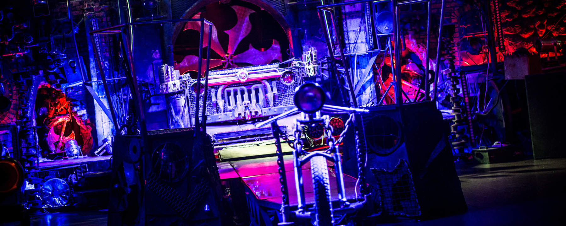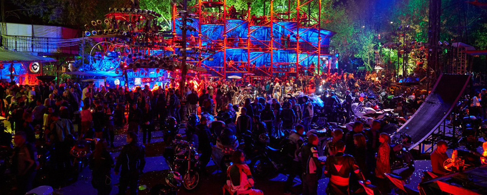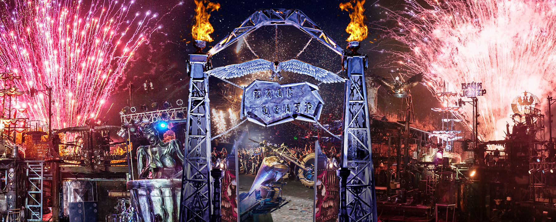 Стоит ступить на территорию Байк-Центра, как взгляд начинает стремительно скользить, стараясь охватить всю площадку. Под открытым небом разместилась огромная многоуровневая сцена, каждый ярус которой представляет собой сложную техническую конструкцию, состоящую из различных динамических объектов. Над сценой виднеется фигура огромного огнедышащего дракона.