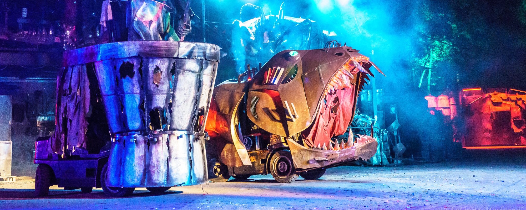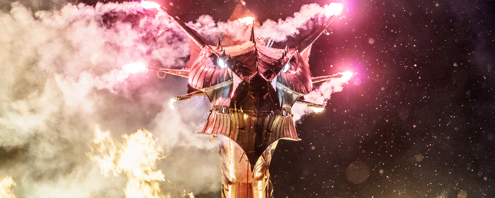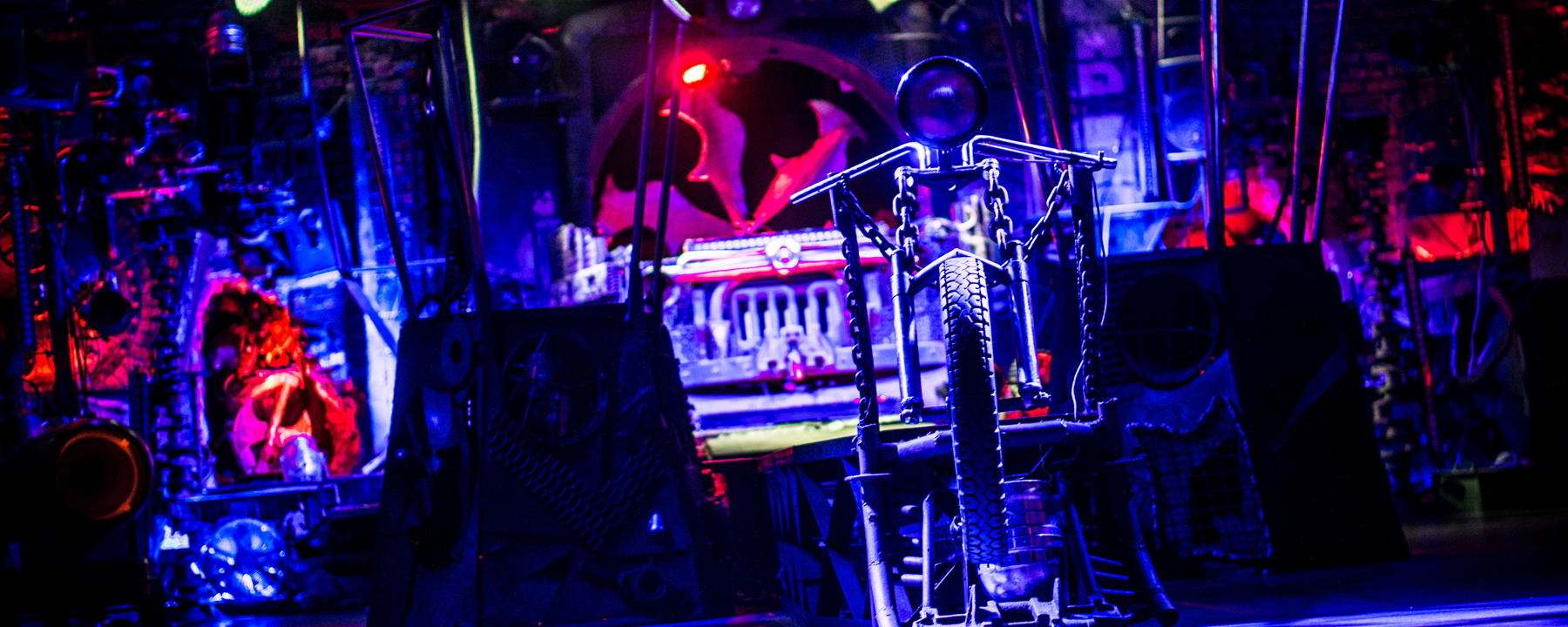 Стоит ступить на территорию Байк-Центра, как взгляд начинает стремительно скользить, стараясь охватить всю площадку. Под открытым небом разместилась огромная многоуровневая сцена, каждый ярус которой представляет собой сложную техническую конструкцию, состоящую из различных динамических объектов. Над сценой виднеется фигура огромного огнедышащего дракона.