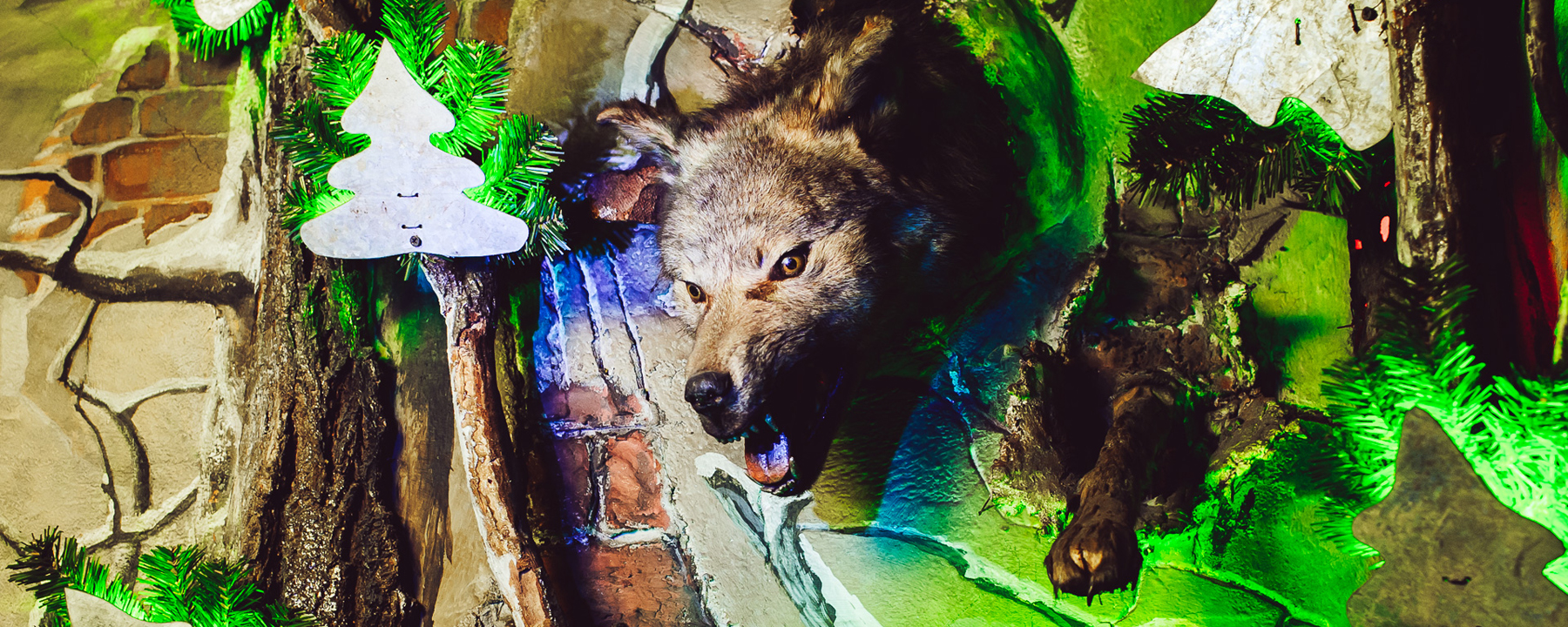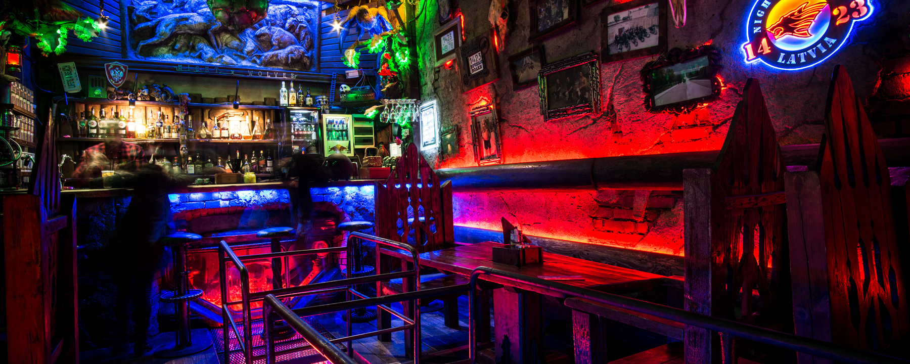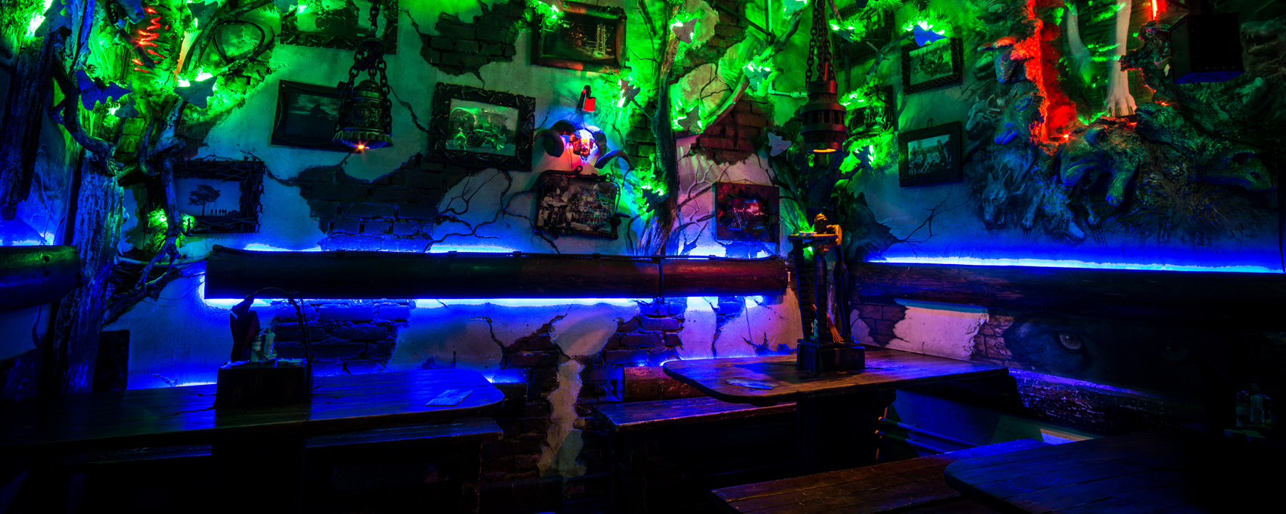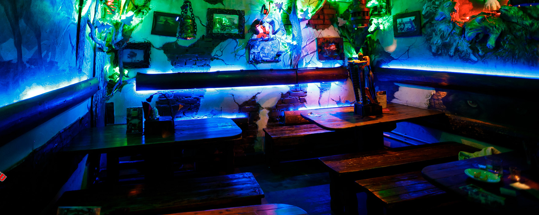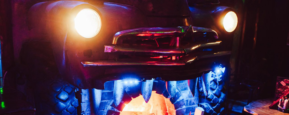 Деревянная массивная мебель с отделкой из шкур диких животных, брутальные кованые элементы декора, граффити. Замысловатые причудливые формы, барные стулья, сделанные из мотоциклетных седел, горящие свечи, огромные газовые фонари, неизменные интерьерные элементы из авто и мотозапчастей - создают неординарную, почти сказочную и, вместе с тем, очень уютную обстановку.
