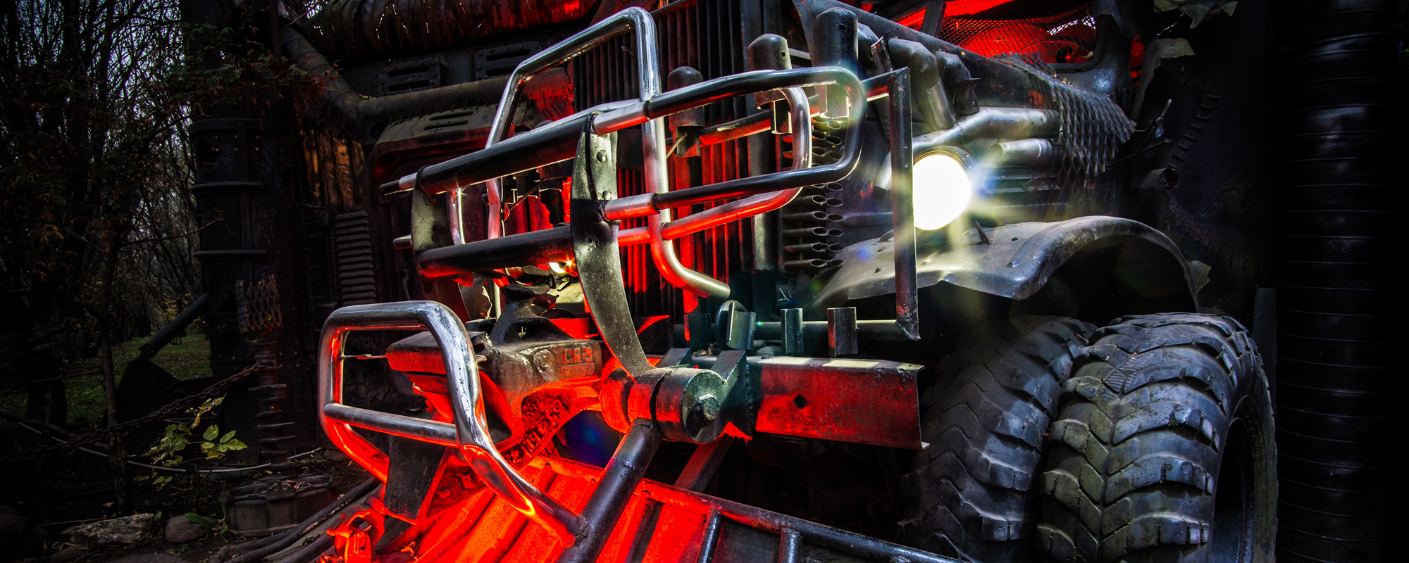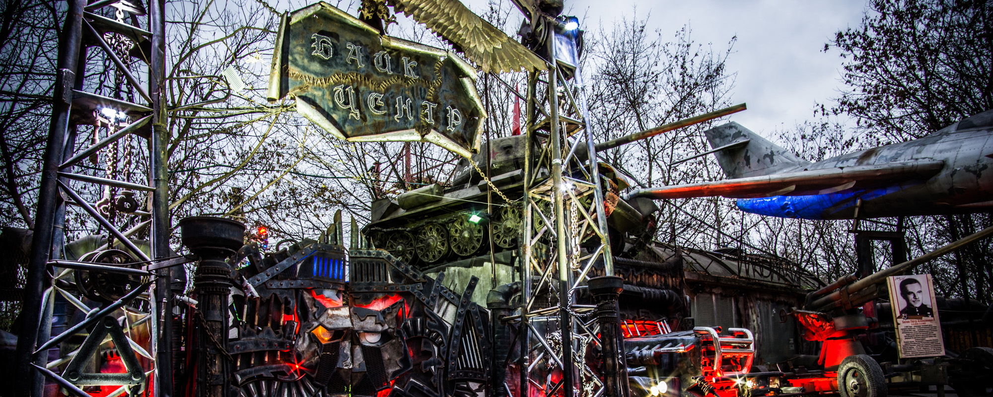 Погружение в загадочный мир Безумного Макса начинается от самого входа в Байк-Центр. В вышине застыл истребитель МиГ-15, из стен торчат харизматичные «морды» разных автомобилей. На постаменте расположился советский танк.
