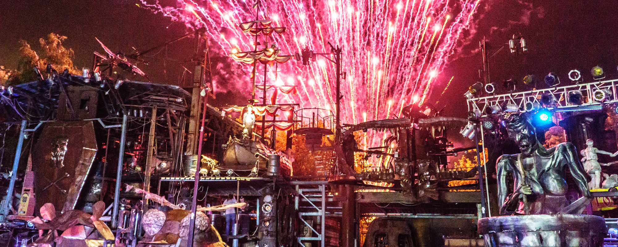 Рядом расположились парусный корабль, пушка, и рампа для мотофристайла. Диковинные элементы декораций, огромные фигуры из металла, сложные металлические сплетения при свете дня кажутся чем-то хаотическим и непонятным, но с началом представлений они приобретают новые формы, «оживают» и в совокупности создают невероятное по зрелищности действо. Таким сейчас предстает перед гостями Байк-центр, чей уникальный образ постоянно совершенствуется, дополняется новыми деталями и чертами.