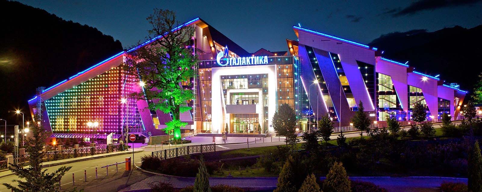 Общественно-культурный центр «Галактика»* располагается в живописной долине на высоте 540 метров над уровнем моря. Транспортная доступность: скоростная железная дорога в 40 км от Сочи, современная автодорога и автобусное сообщение. Рестораны, боулинг, ледовая арена, аквапарк, 3 кинозала, бассейны в аквапарке, бильярдный клуб, детский интерактивно-развивающий клуб.
