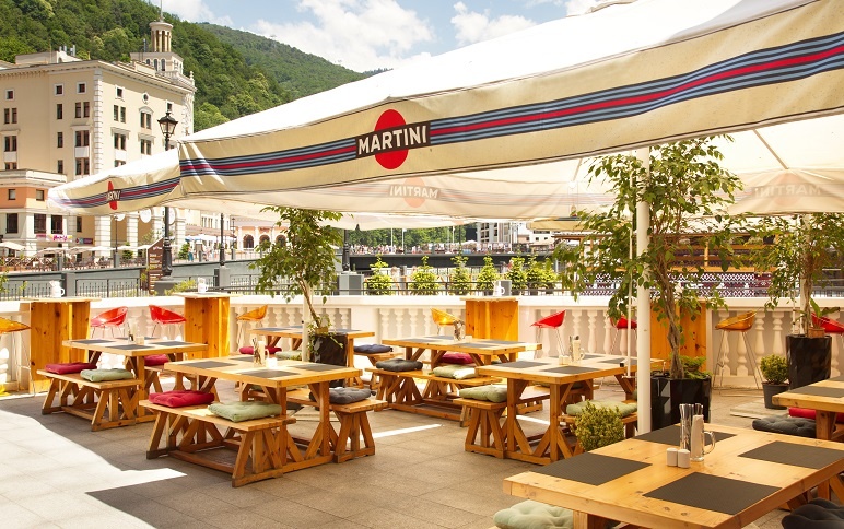С прилегающей к ресторану летней террасы открывается великолепный вид на горные вершины Кавказа. Терраса ресторана вместимостью до 30 человек идеально подходит для проведения различных мероприятий.